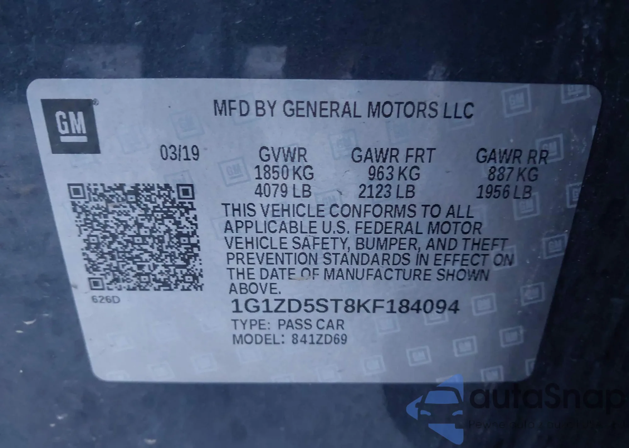 LOT: 43475013 VIN: 1G1ZD5ST8KF184094