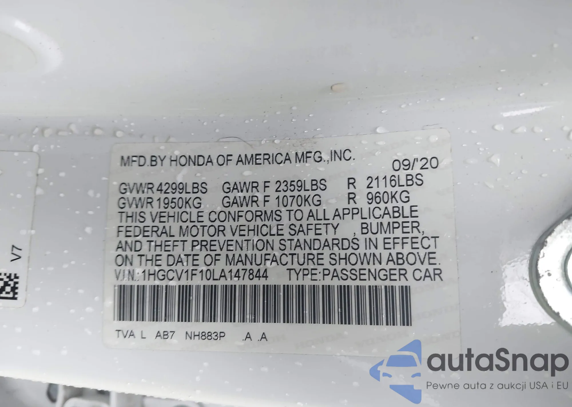 LOT: 43264396 VIN: 1HGCV1F10LA147844