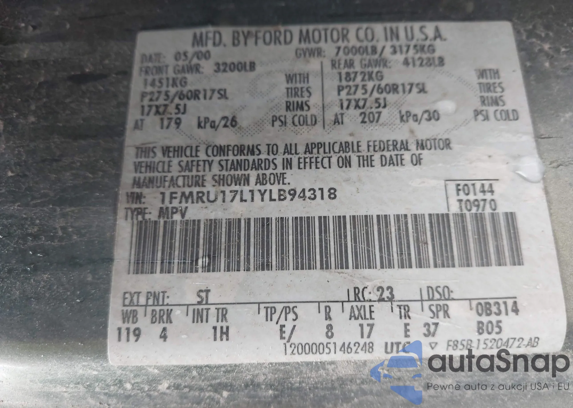 • VIN 4S3BWAF60N3011997