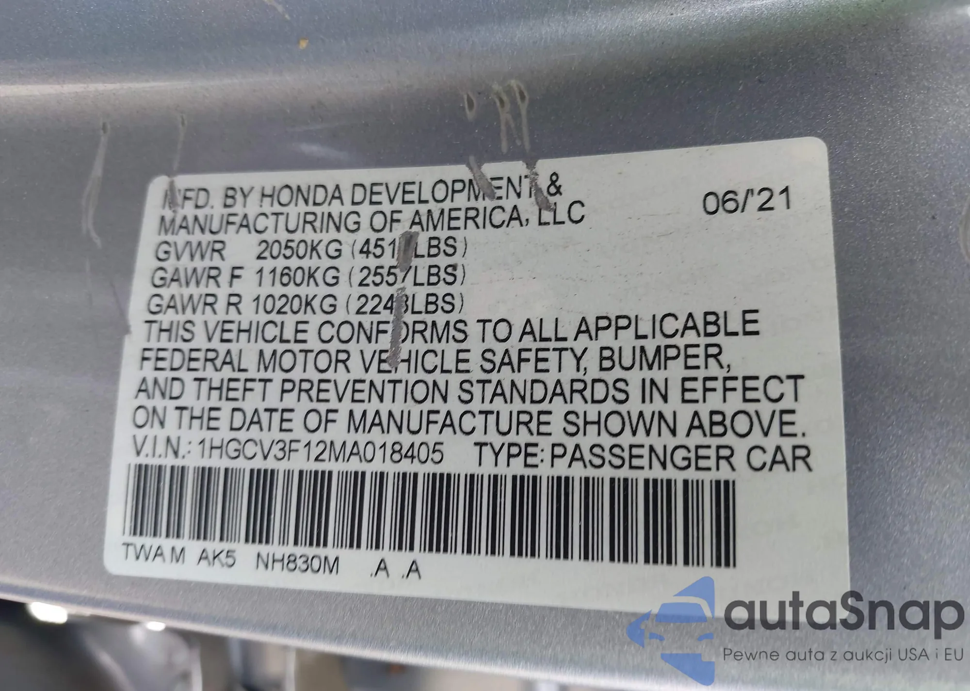 LOT: 43368100 VIN: 1HGCV3F12MA018405