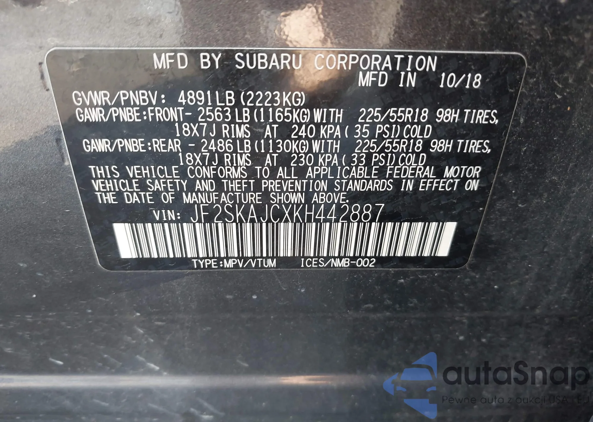 LOT: 43387715 VIN: JF2SKAJCXKH442887