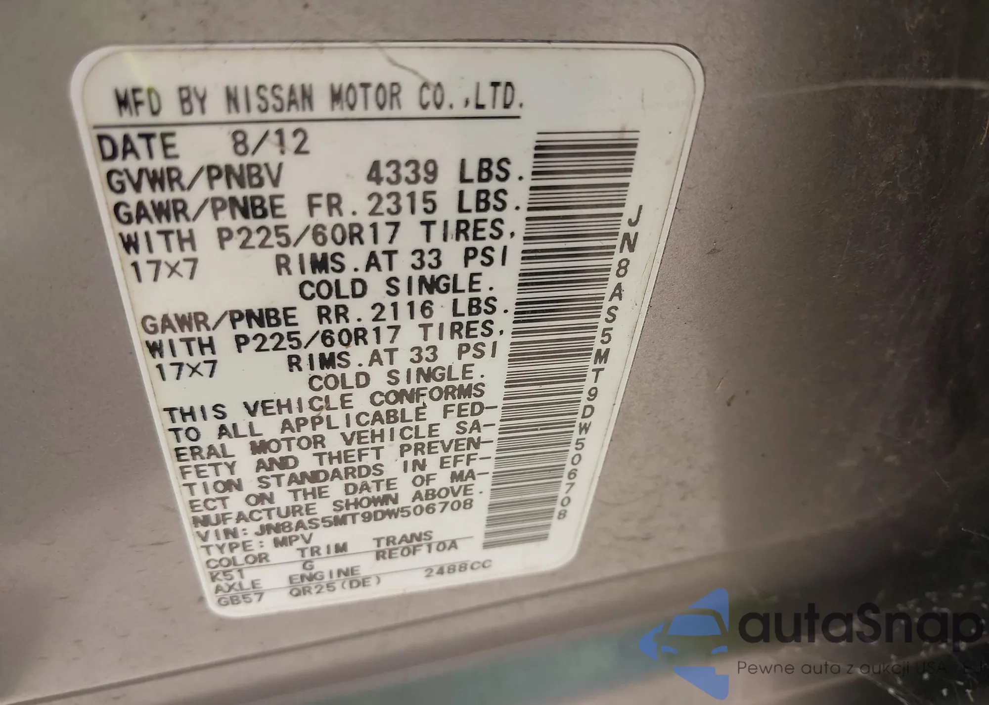 LOT: 43340277 VIN: JN8AS5MT9DW506708