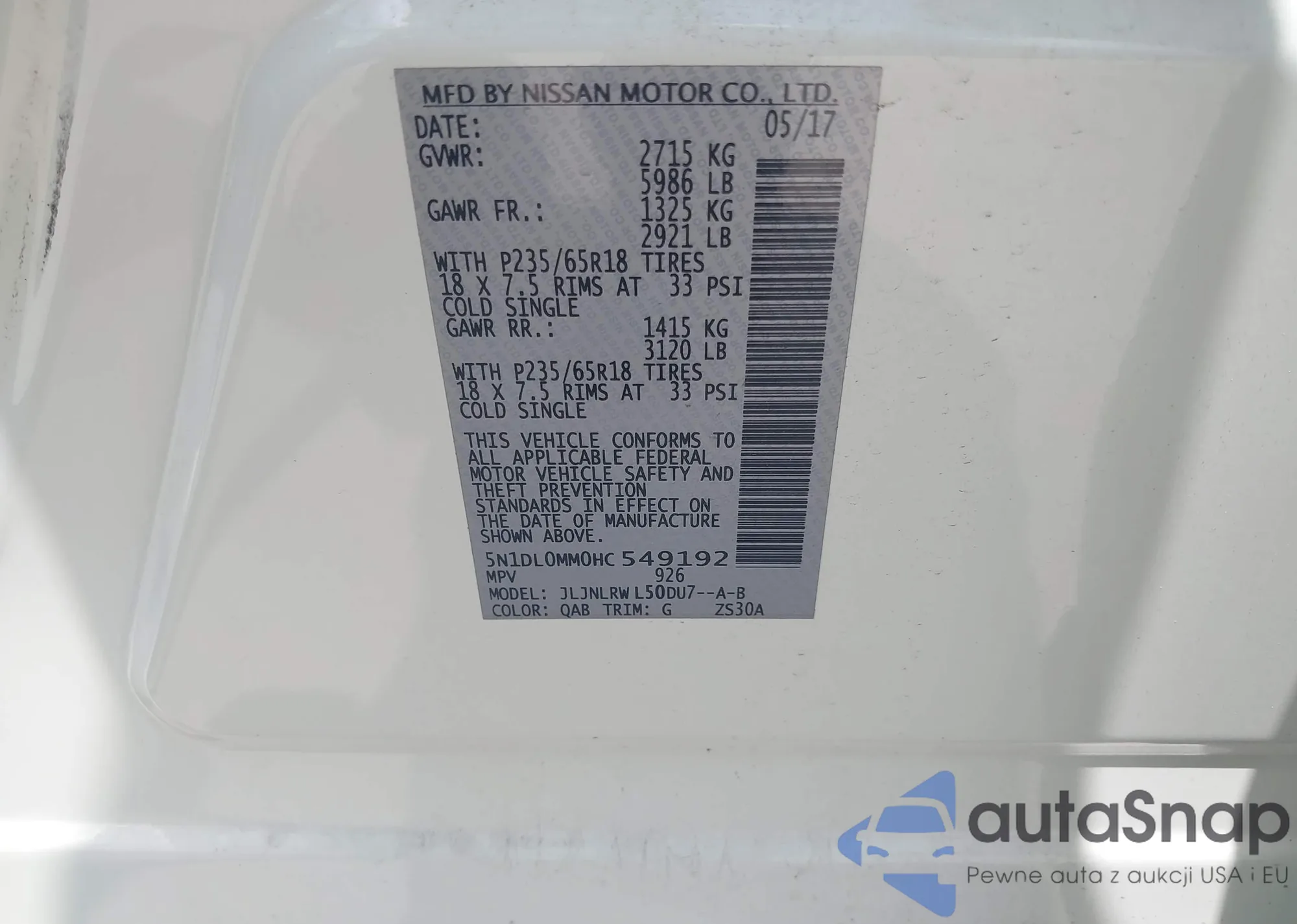 • VIN 5N1DL0MM0HC549192