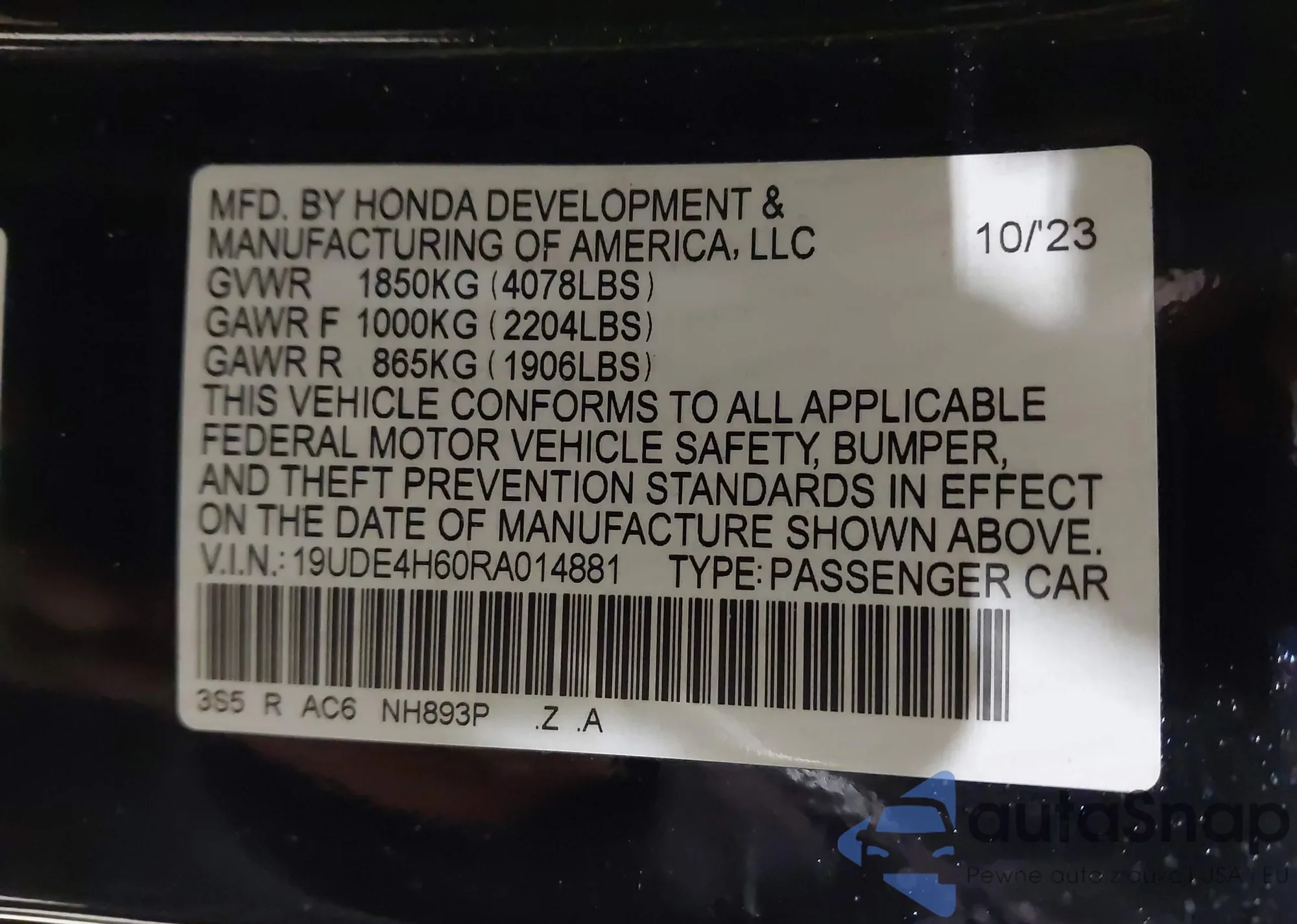 • VIN 19UDE4H60RA014881