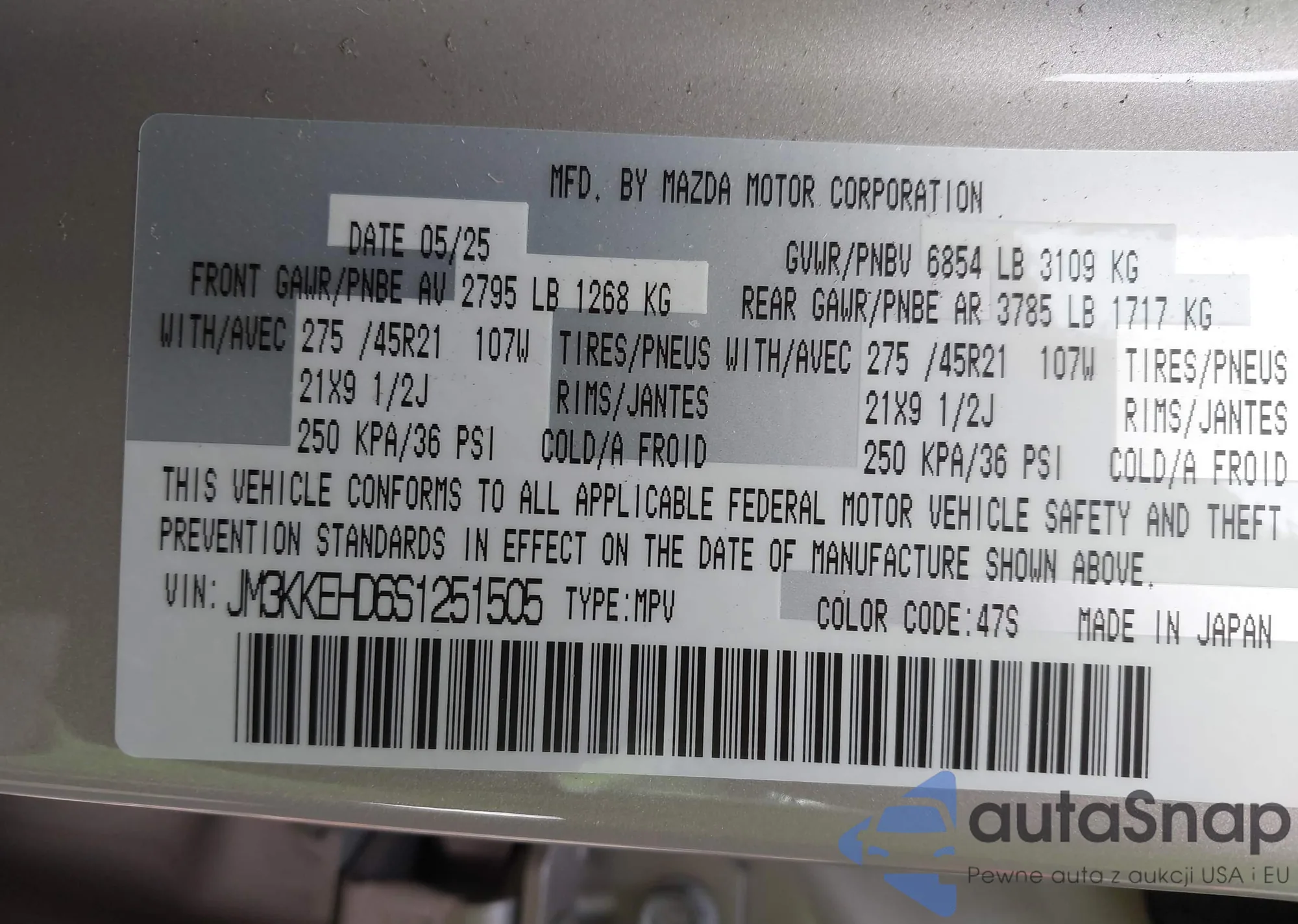 LOT: 43600633 VIN: JM3KKEHD6S1251505