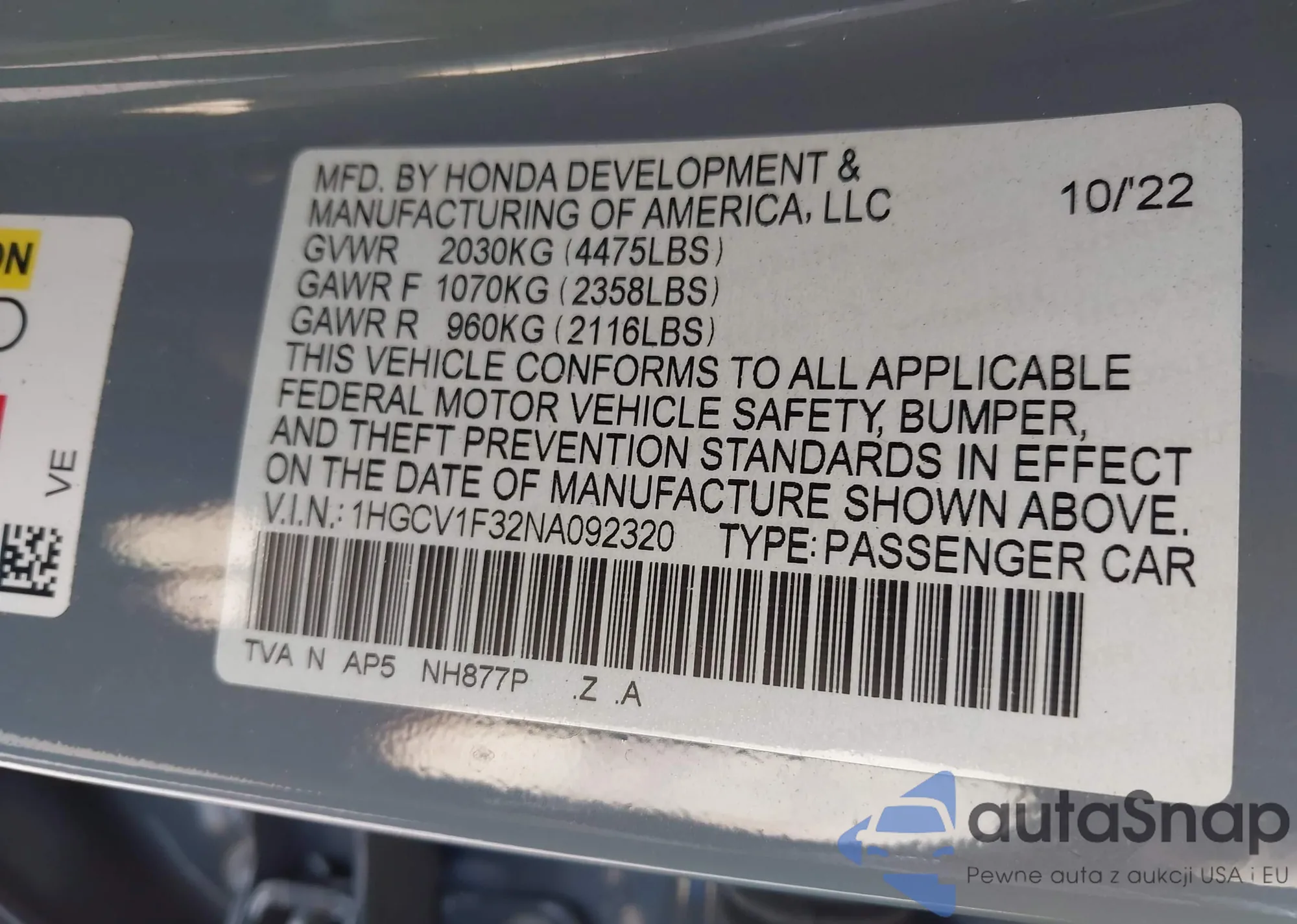 • VIN 1HGCV1F32NA092320