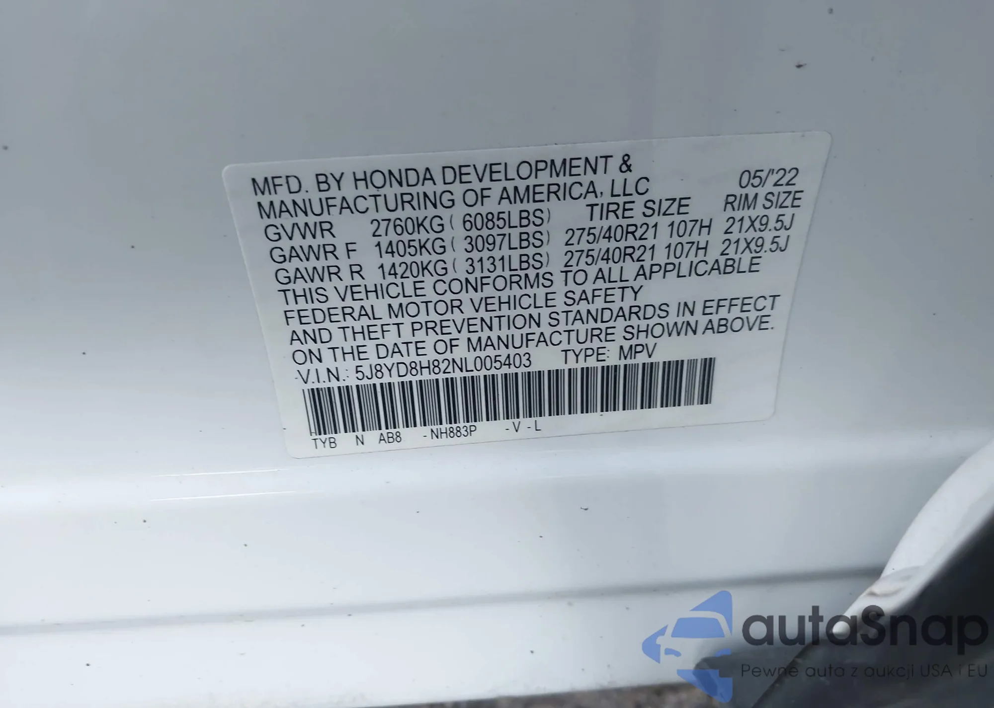 • VIN 5J8YD8H82NL005403