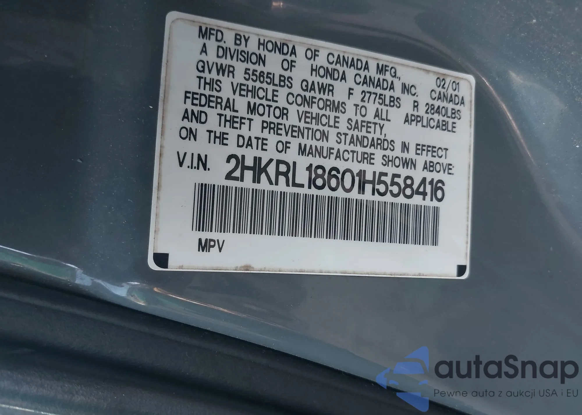 • VIN 2HKRL18601H558416