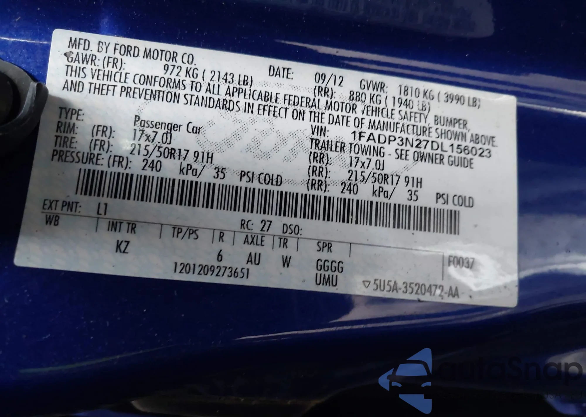 LOT: 43556023 VIN: 1FADP3N27DL156023