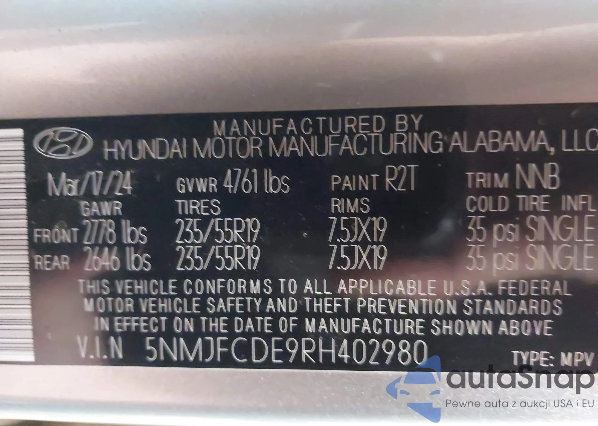 • VIN 5NMJFCDE9RH402980
