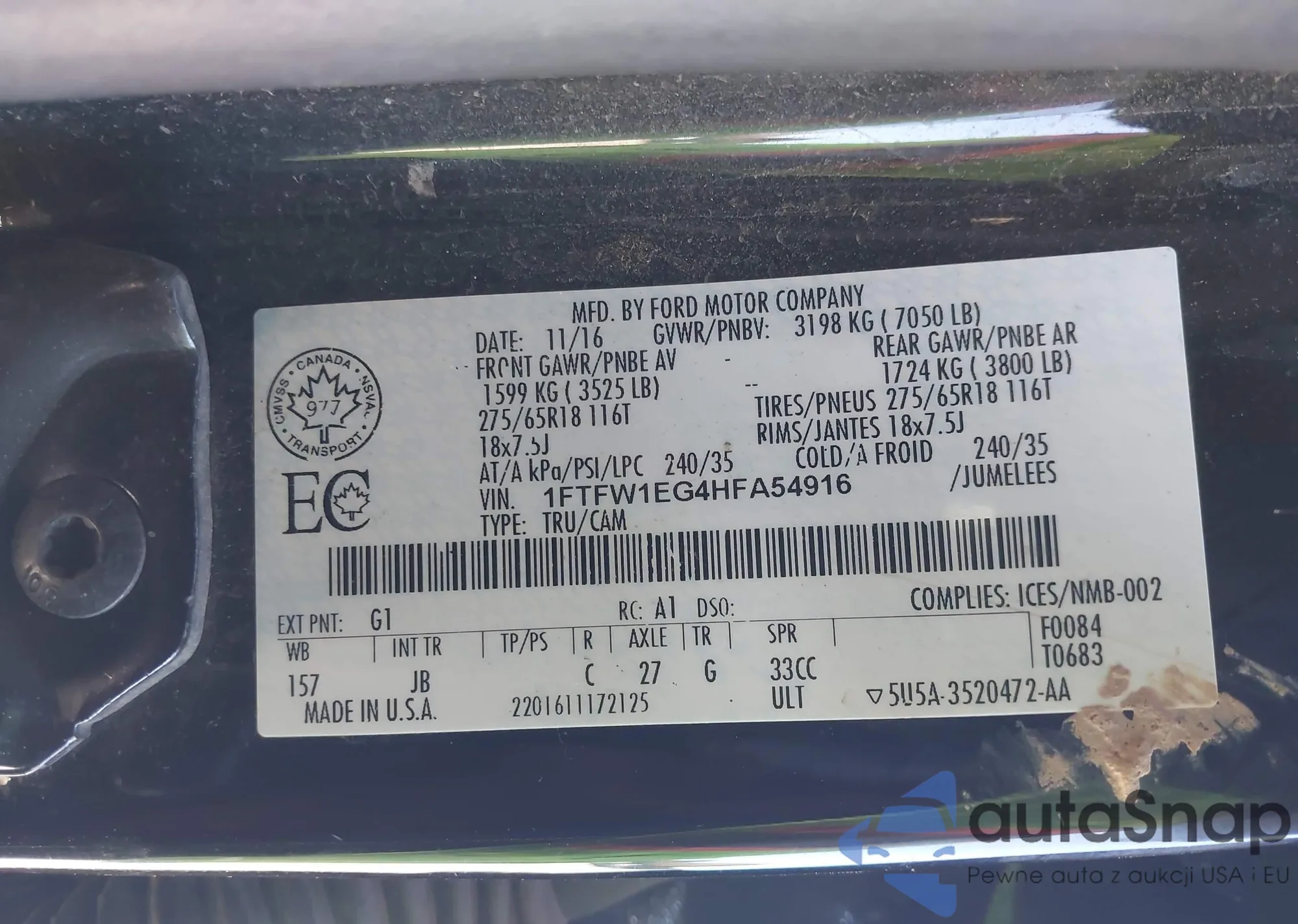 LOT: 43450563 VIN: 1FTFW1EG4HFA54916