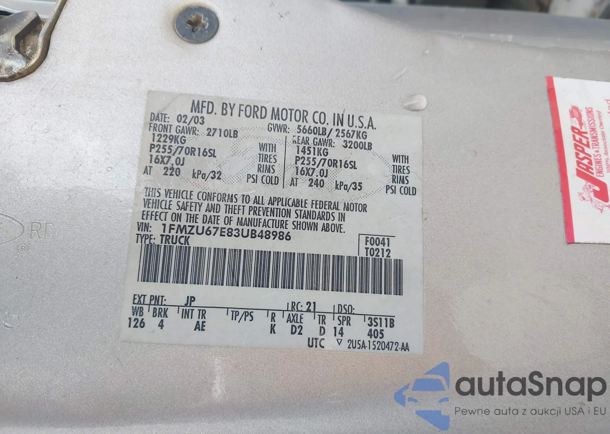• VIN 1FMZU67E83UB48986