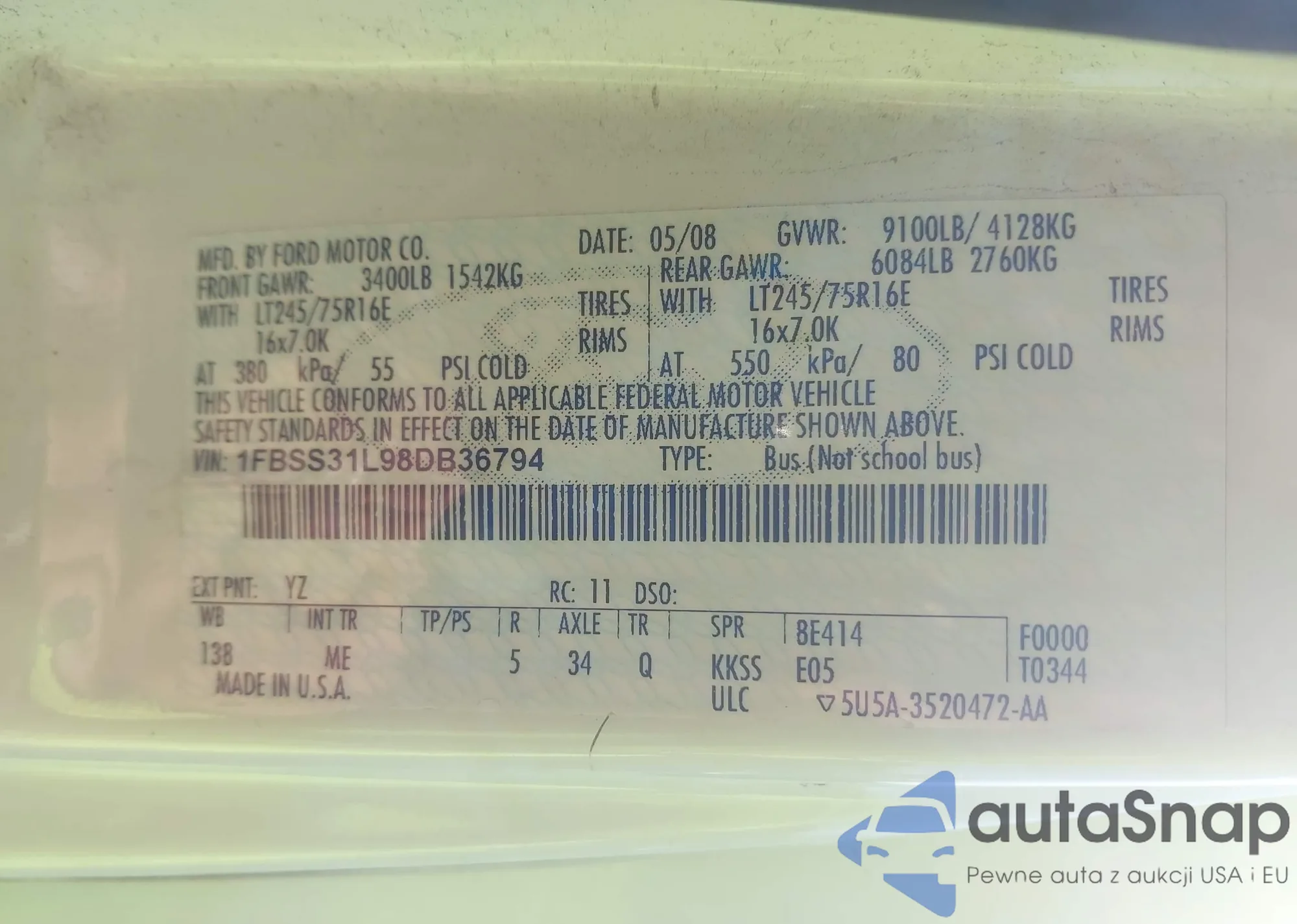 LOT: 43447823 VIN: 1FBSS31L98DB36794