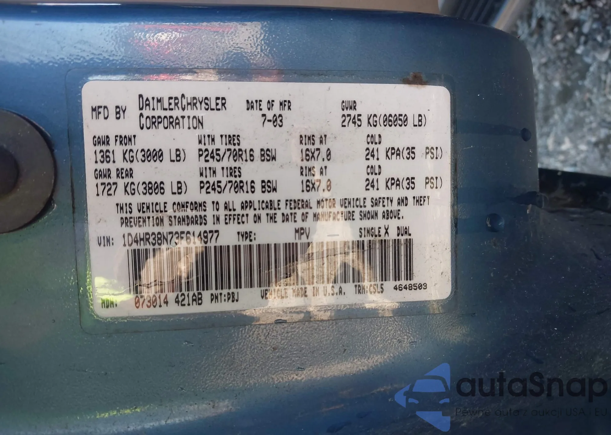 LOT: 43455440 VIN: 1D4HR38N73F614977
