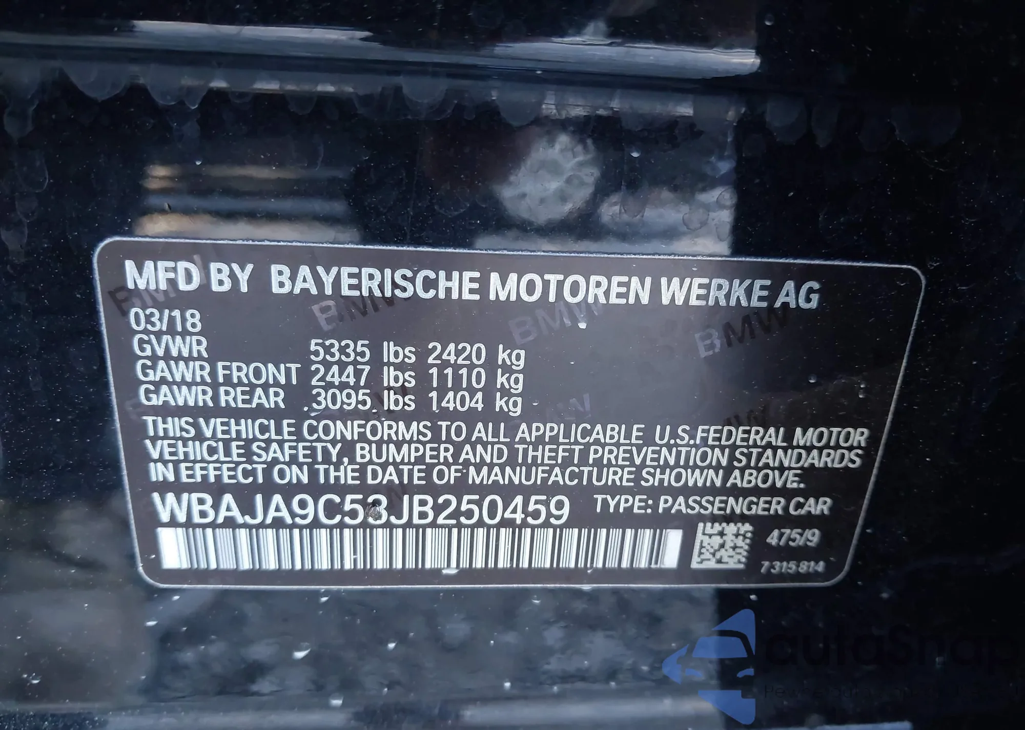 LOT: 43059446 VIN: WBAJA9C53JB250459