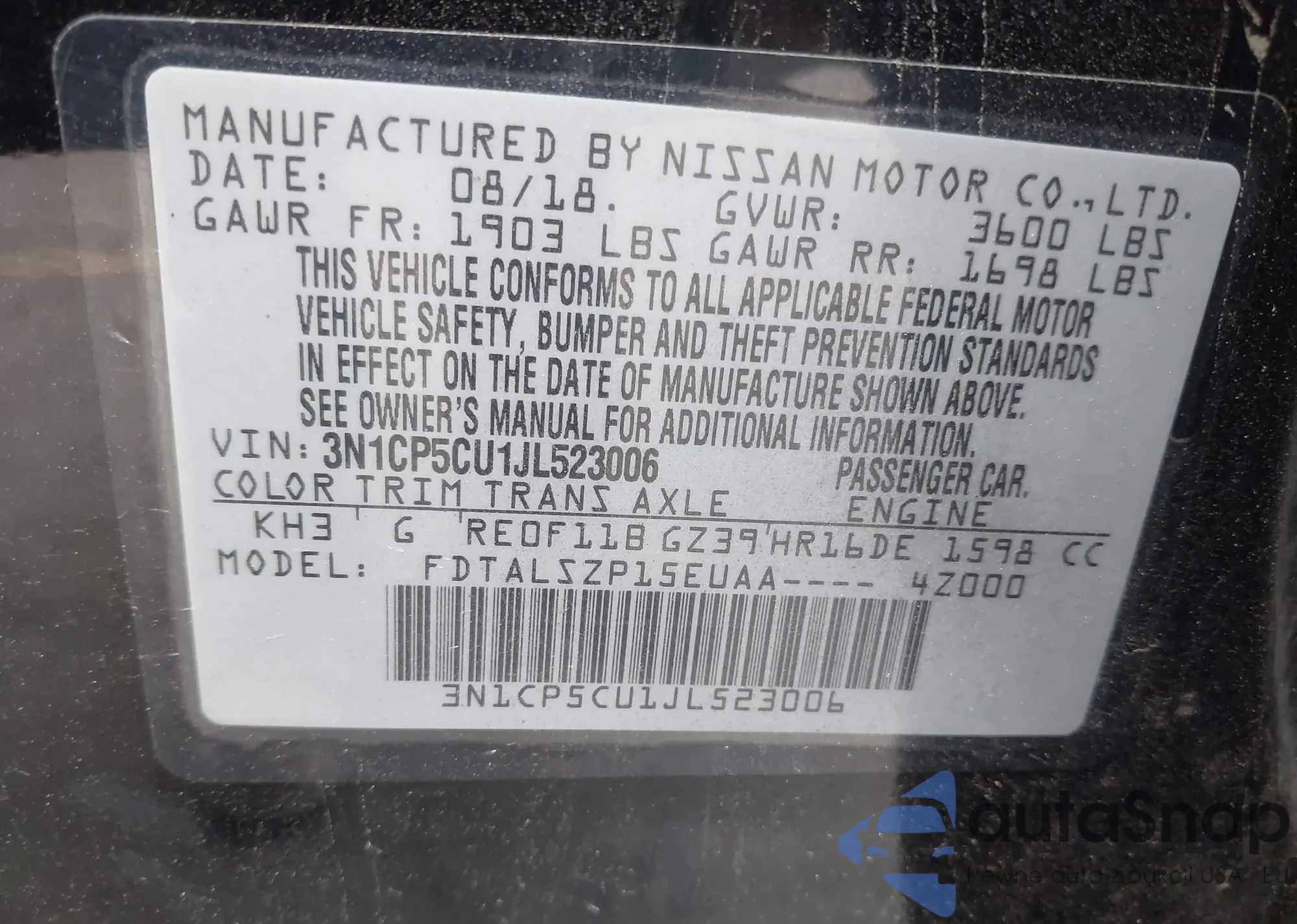 • VIN 3N1CP5CU1JL523006