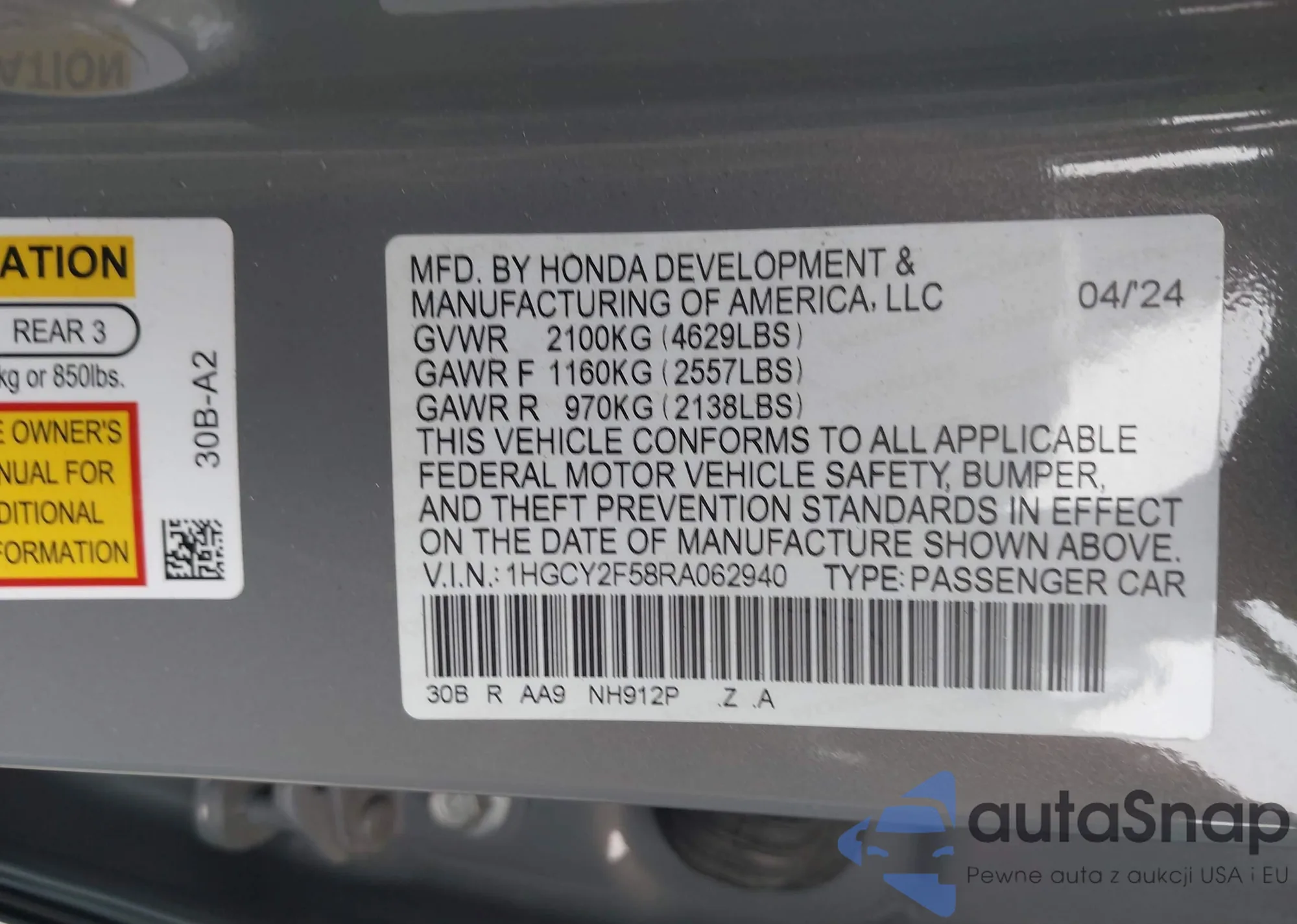 • VIN 1HGCY2F58RA062940