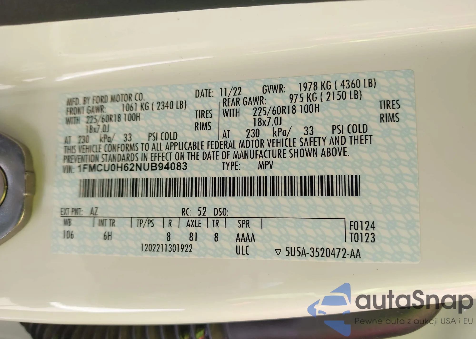 LOT: 43375820 VIN: 1FMCU0H62NUB94083