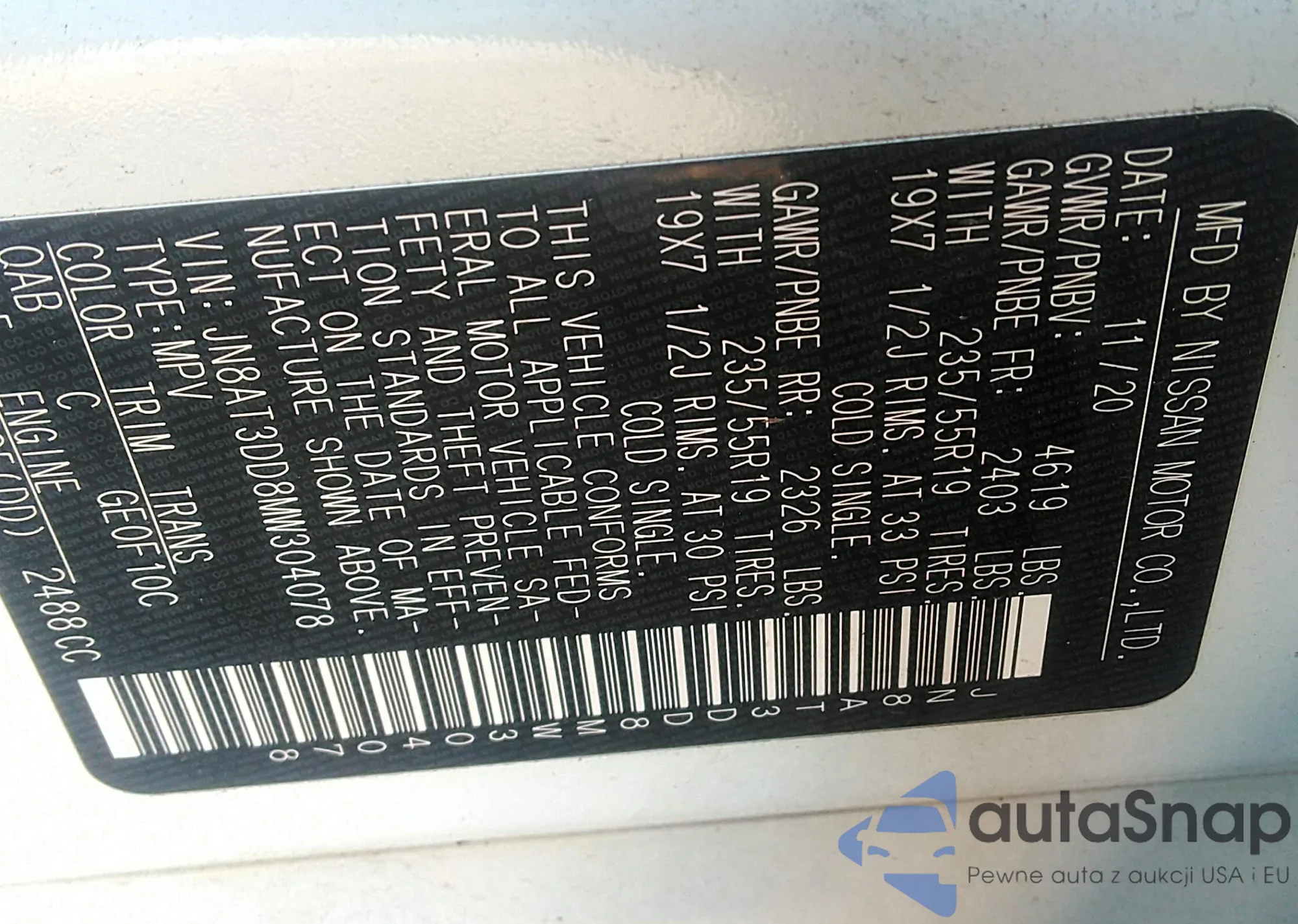 LOT: 43387653 VIN: JN8AT3DD8MW304078