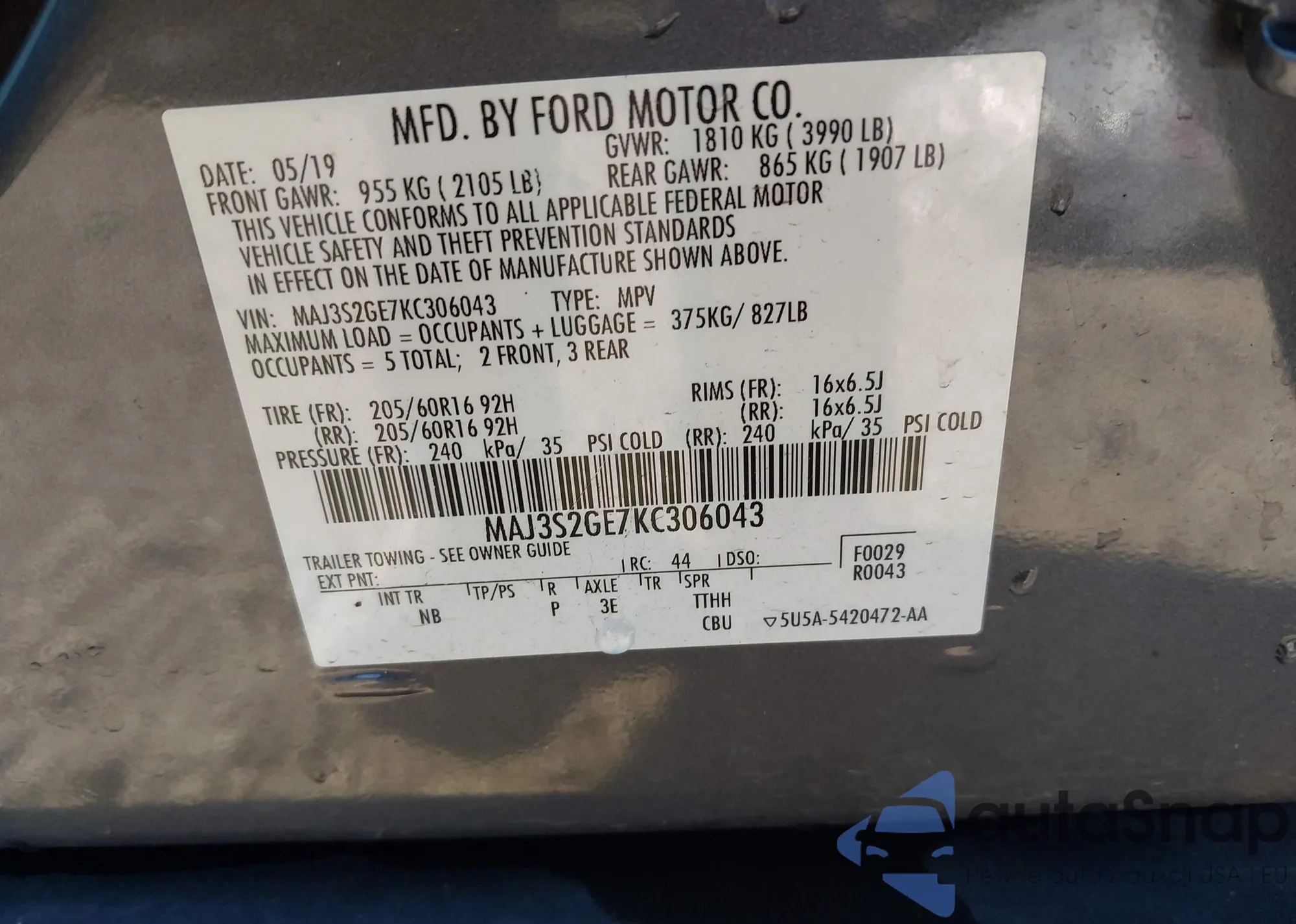 LOT: 43392002 VIN: MAJ3S2GE7KC306043