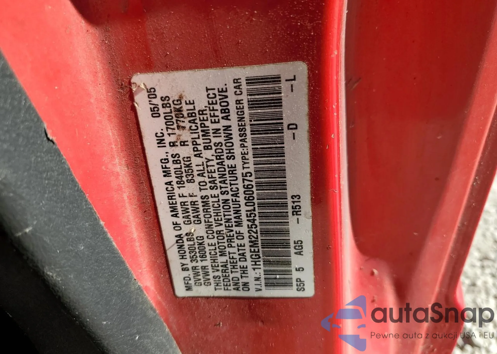 LOT: 84542605 VIN: 1HGCP36829A039513