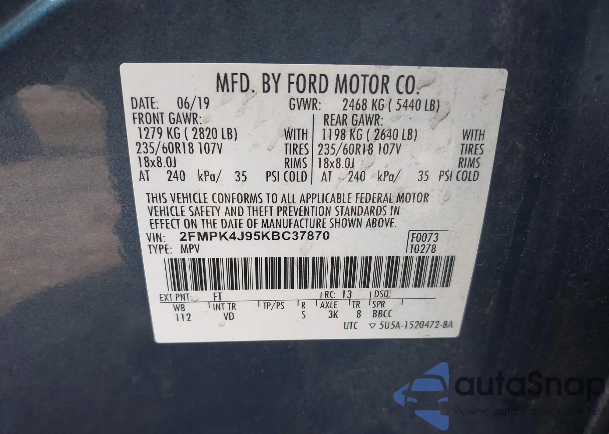 • VIN 2FMPK4J95KBC37870