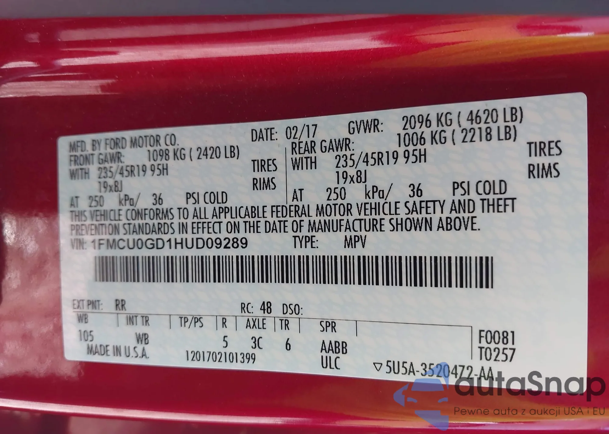 LOT: 43375746 VIN: 1FMCU0GD1HUD09289