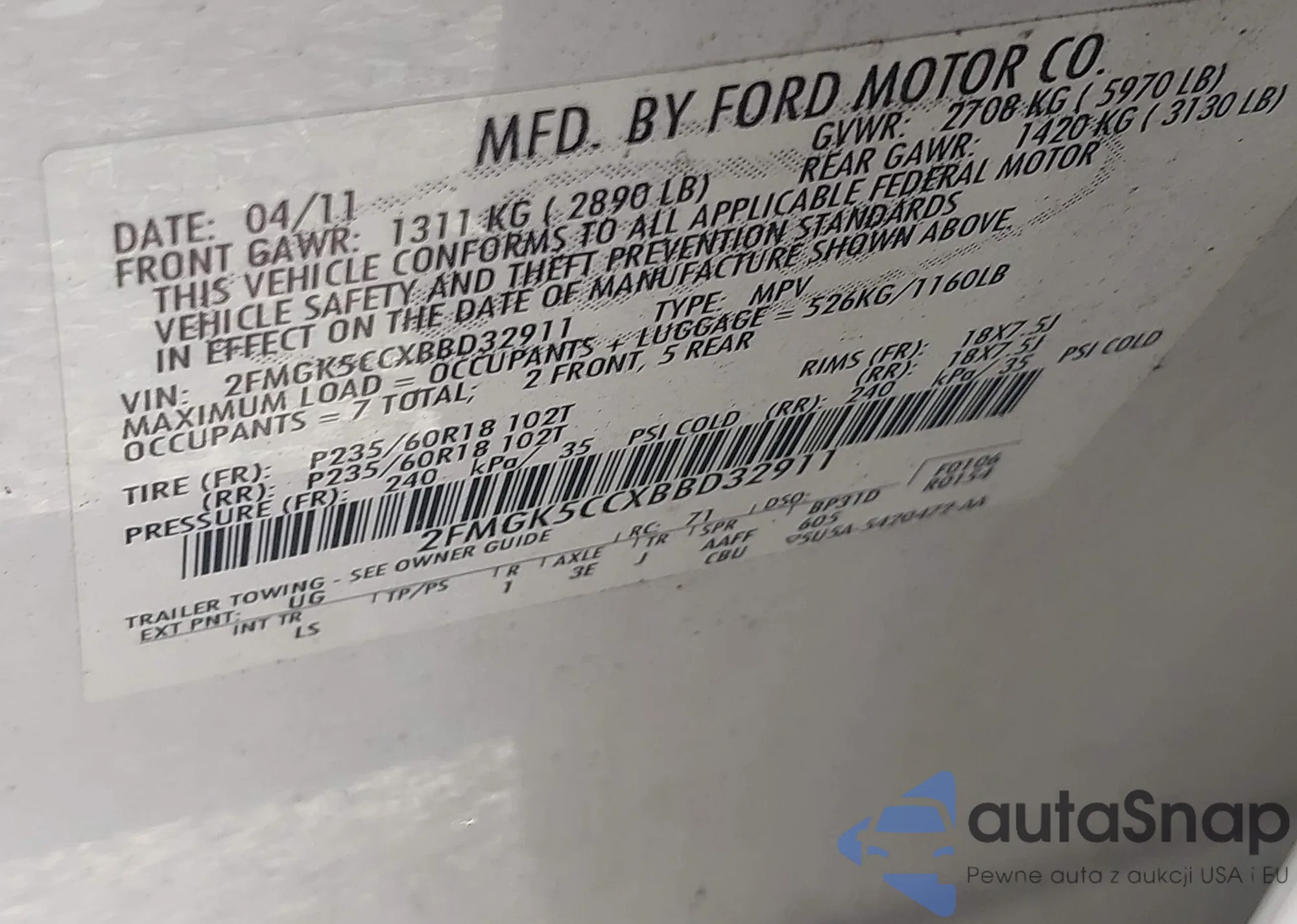 • VIN 2FMGK5CCXBBD32911