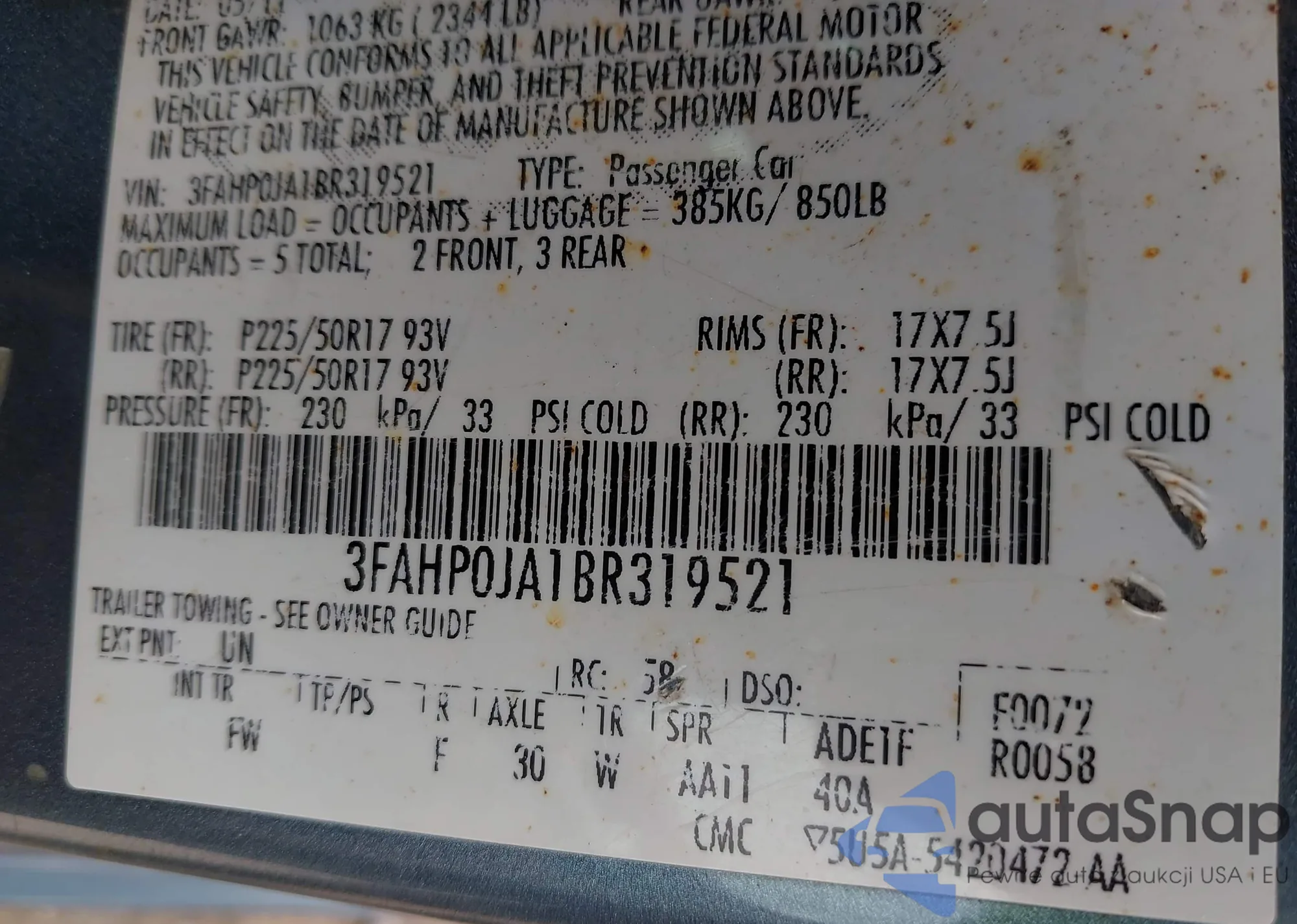 LOT: 42493103 VIN: 3FAHP0JA1BR319521