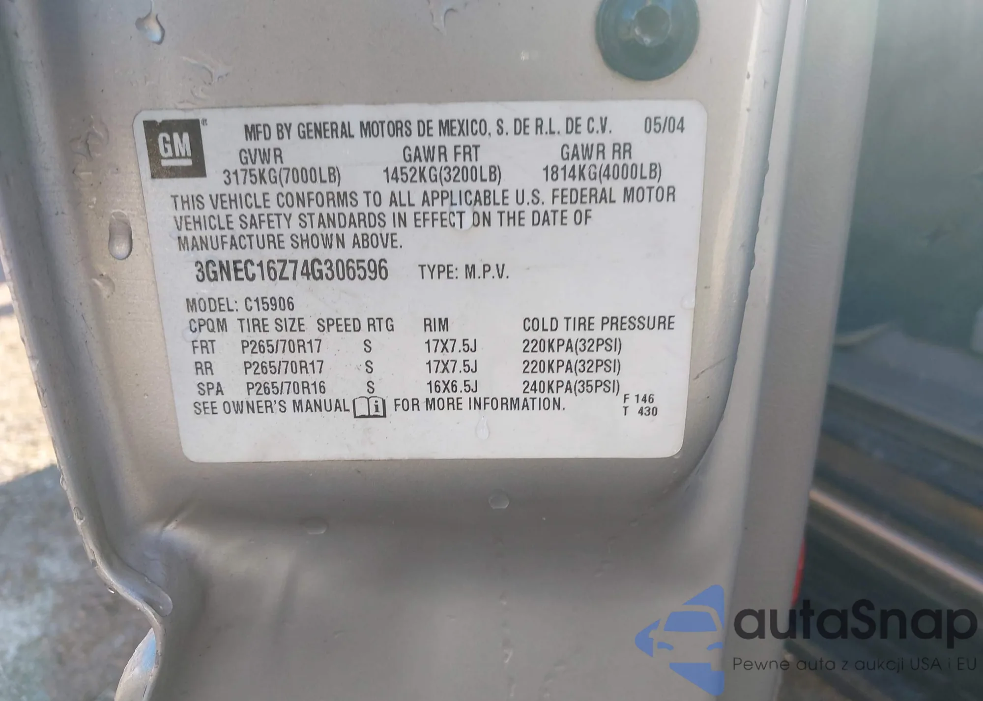 • VIN 3GNEC16Z74G306596