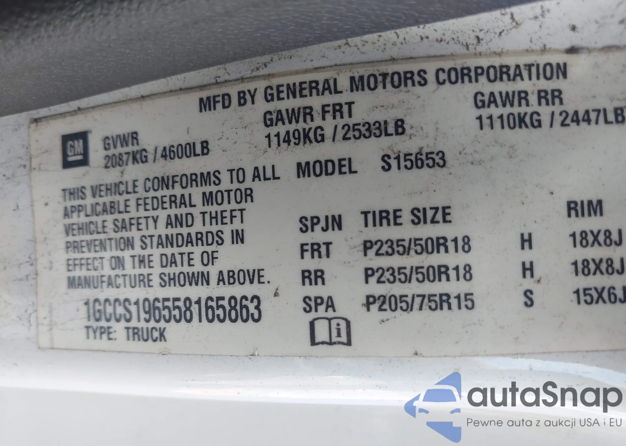 LOT: 42837111 VIN: 1GCCS196558165863