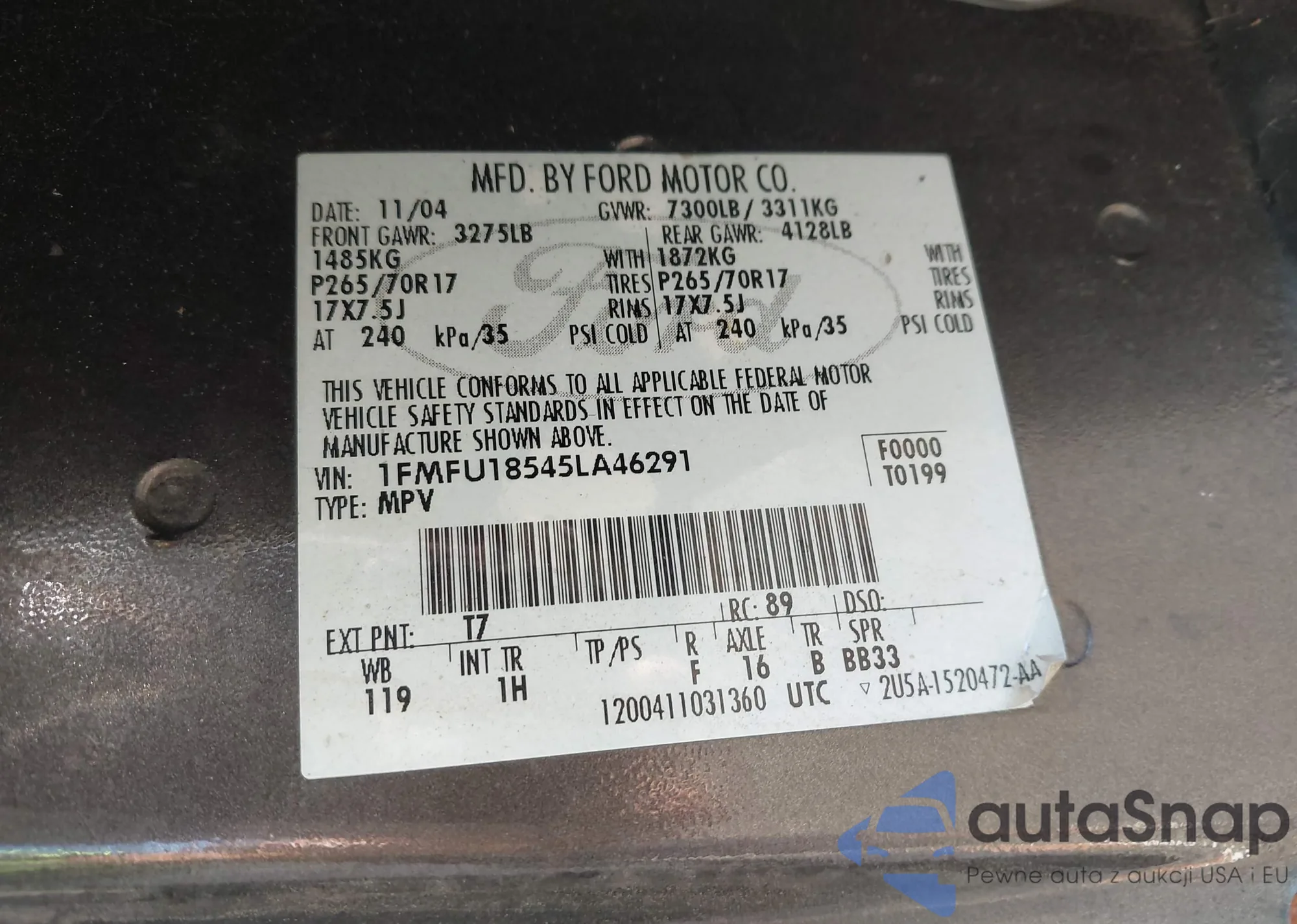 • VIN 1FMCU9J96NUB97013