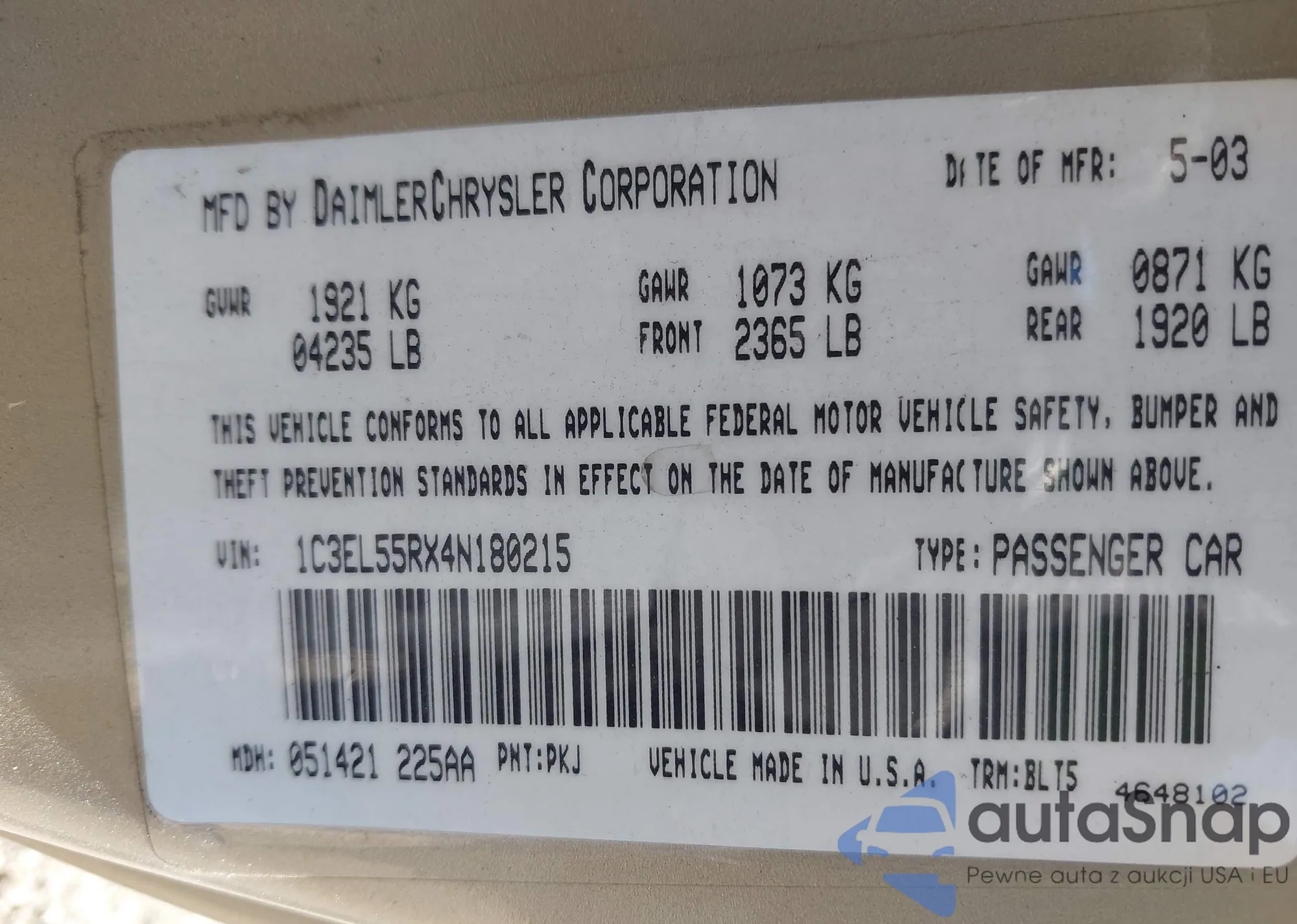 • VIN 1C3EL55RX4N180215