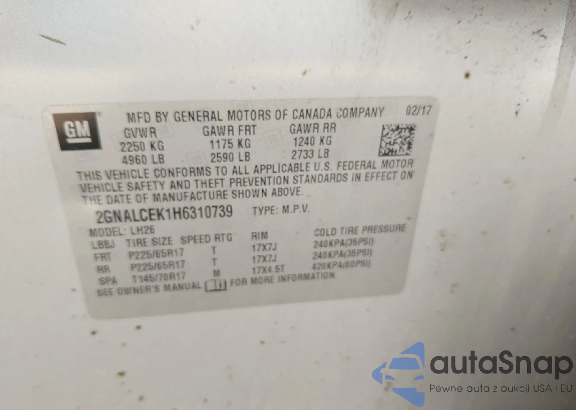 LOT: 43512886 VIN: 2GNALCEK1H6310739