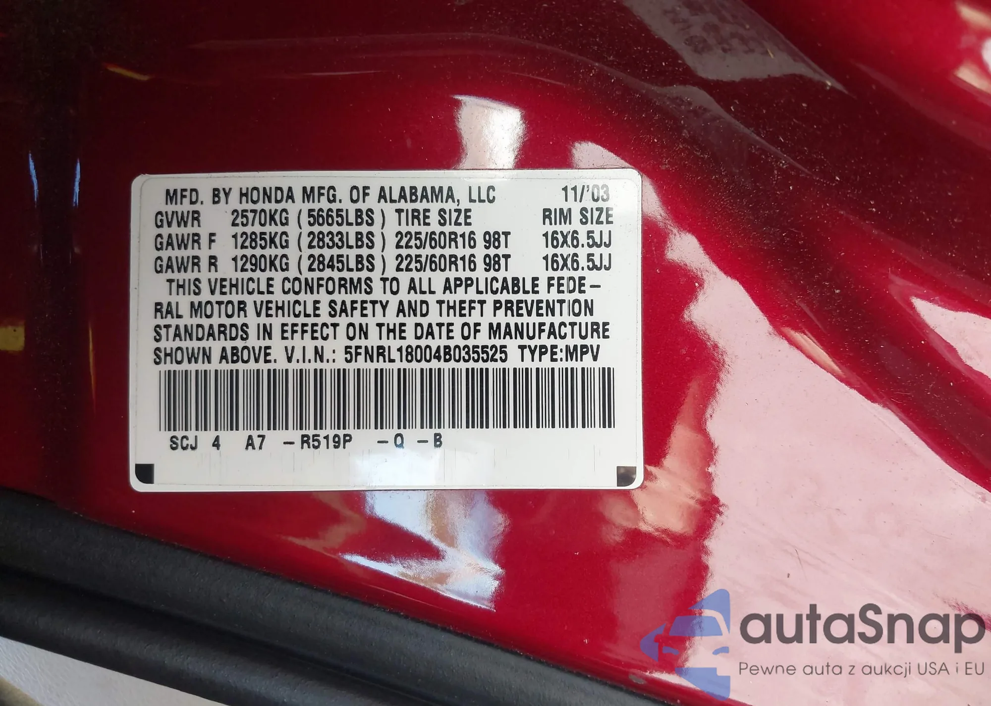• VIN 5FNRL18004B035525
