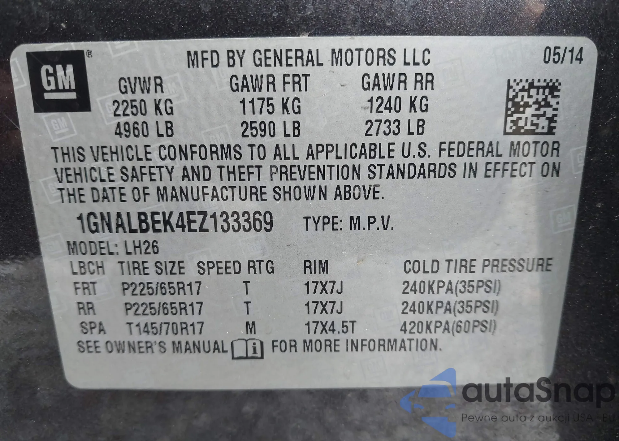 LOT: 43610559 VIN: 1GNALBEK4EZ133369