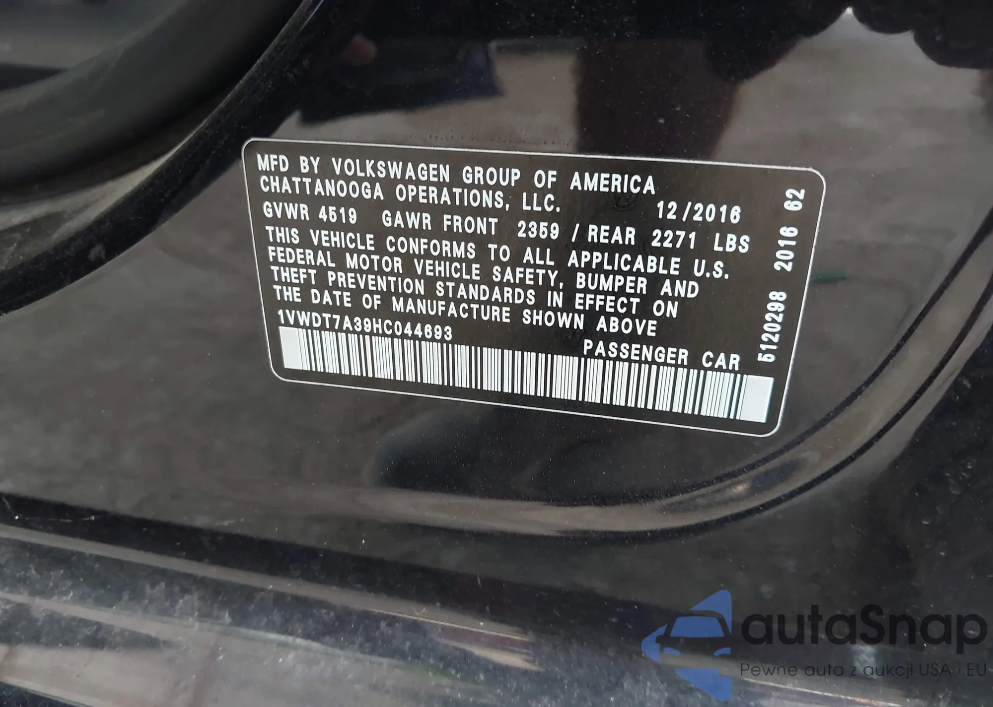 LOT: 42956753 VIN: 1VWDT7A39HC044693