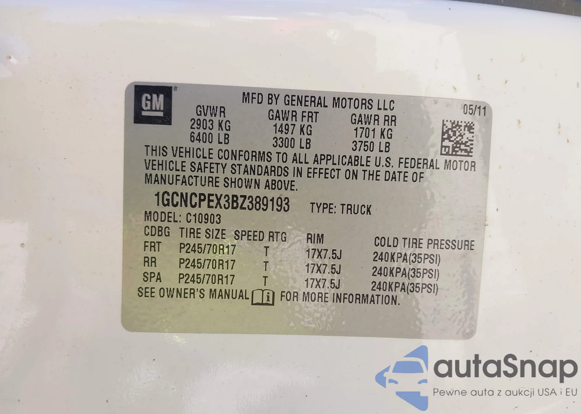 • VIN 1GCNCPEX3BZ389193