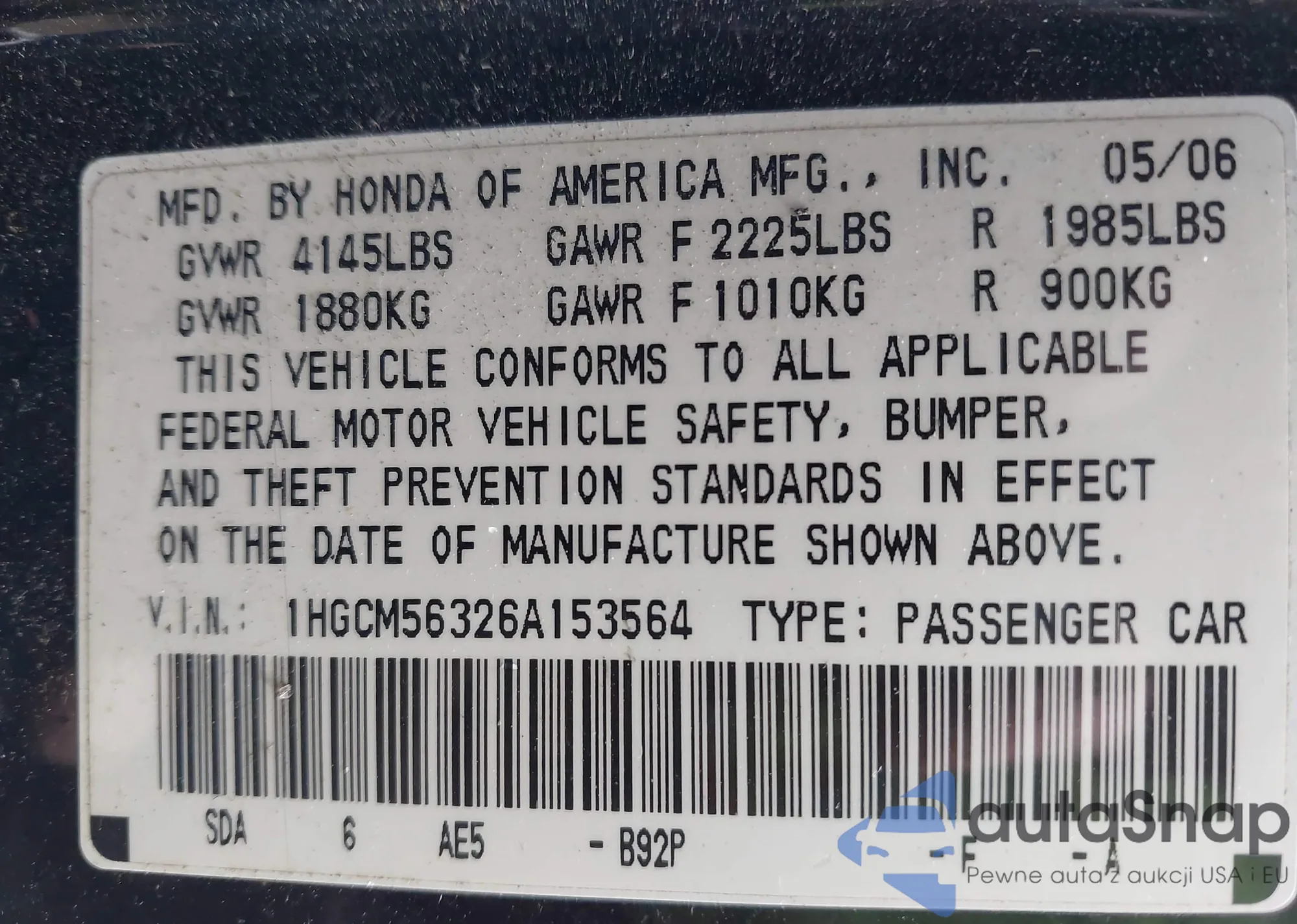 LOT: 43574920 VIN: 1HGCM56326A153564