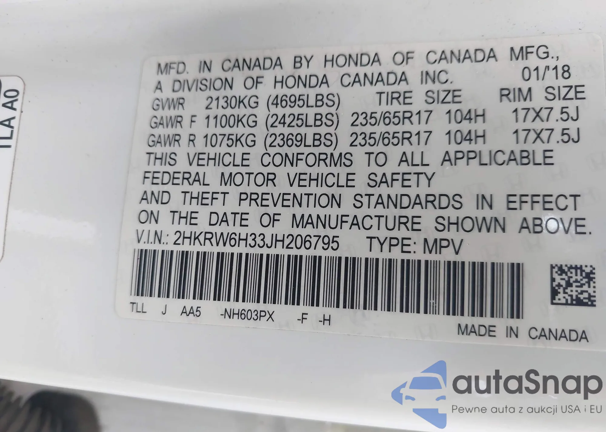 • VIN 2HKRW6H33JH206795