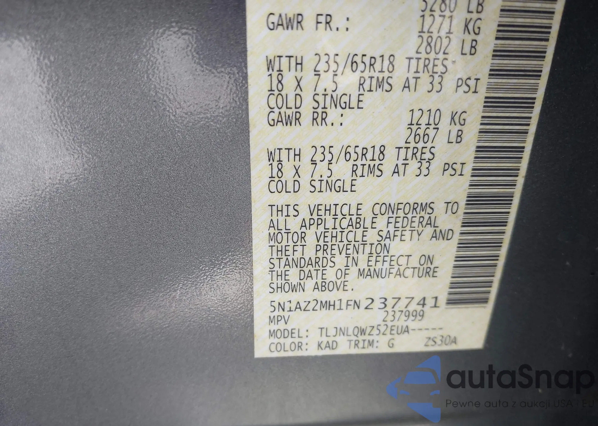 • VIN 5N1AZ2MH1FN237741