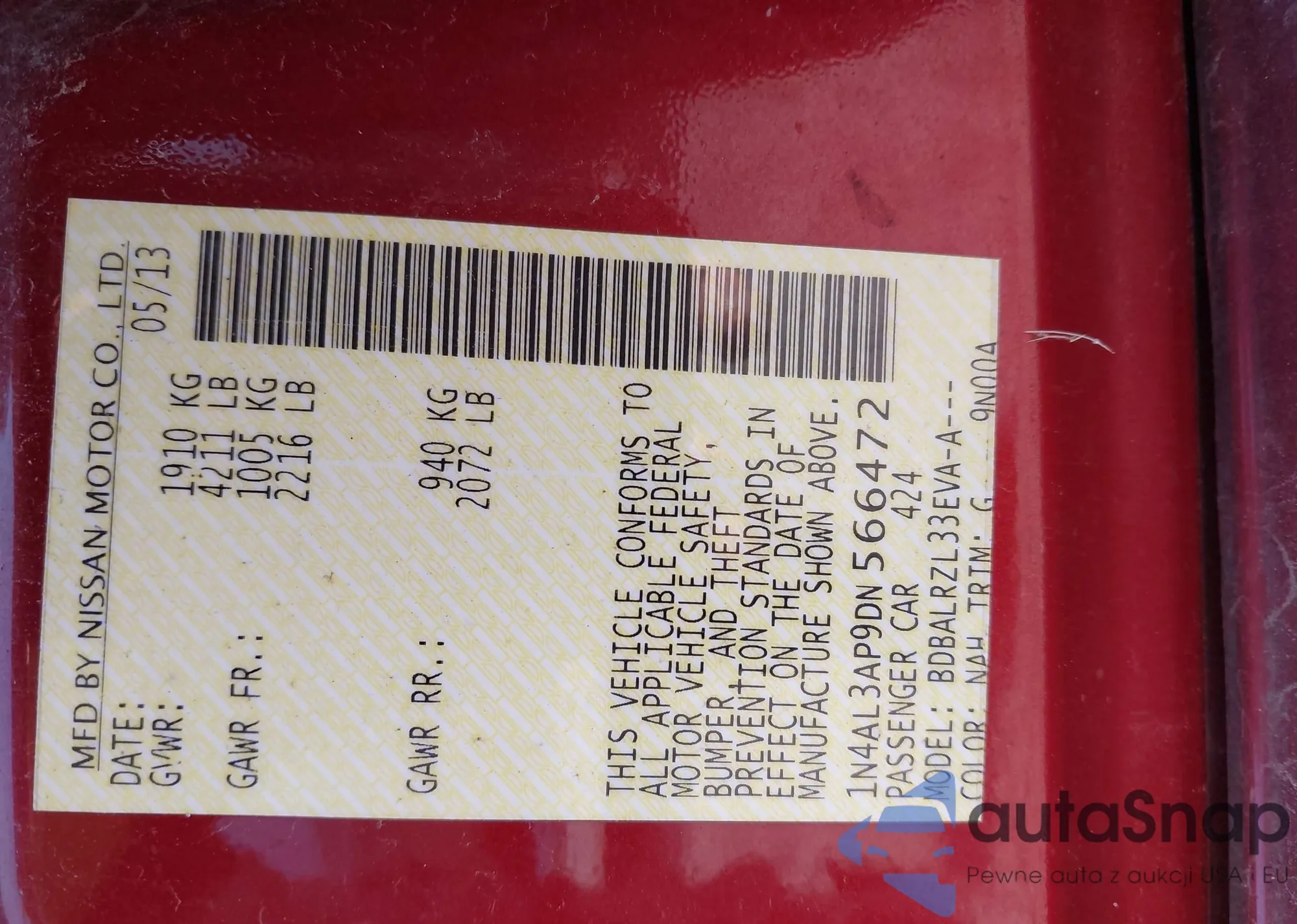 • VIN 1N4AL3AP9DN566472