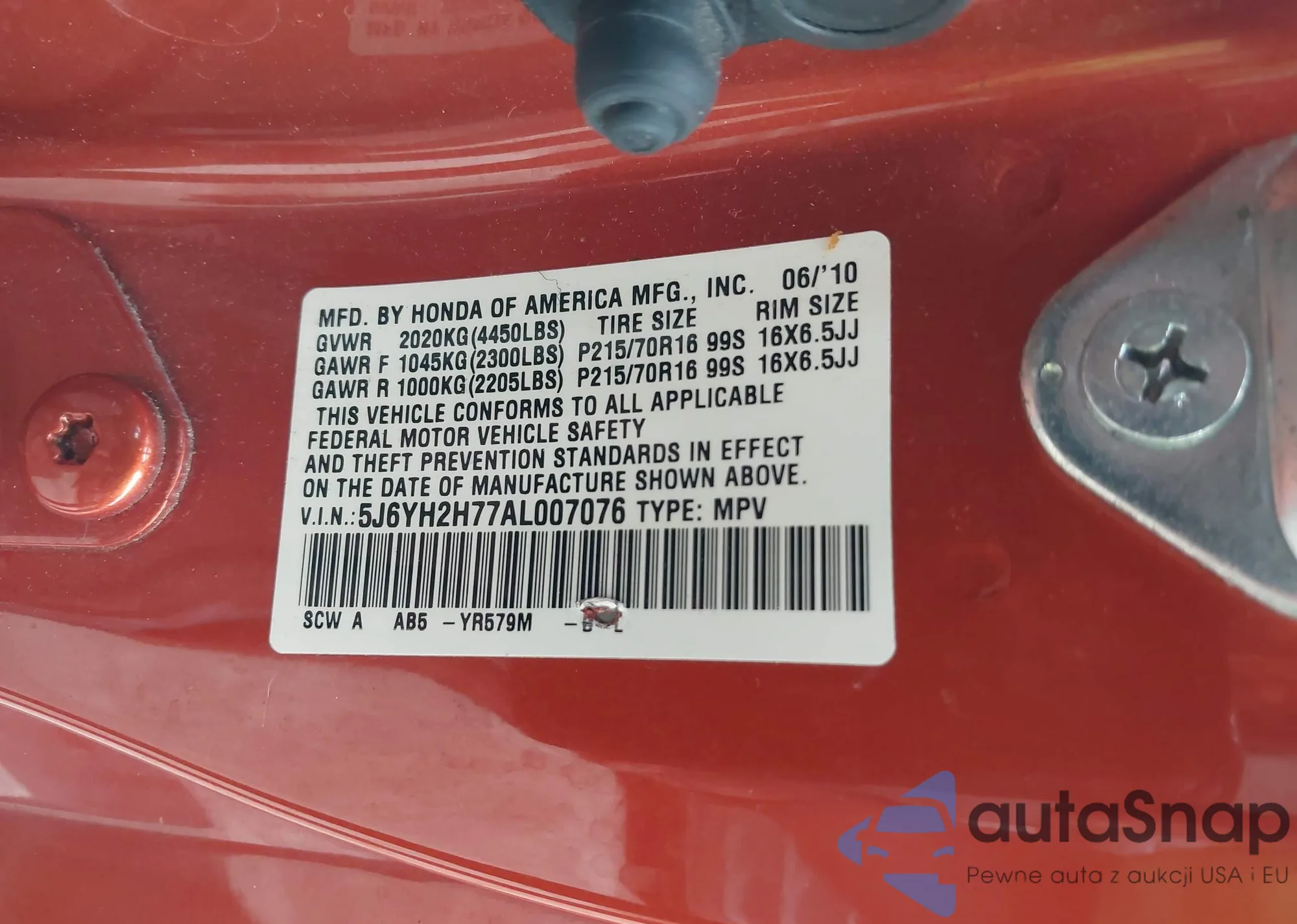 • VIN 5J6YH2H77AL007076