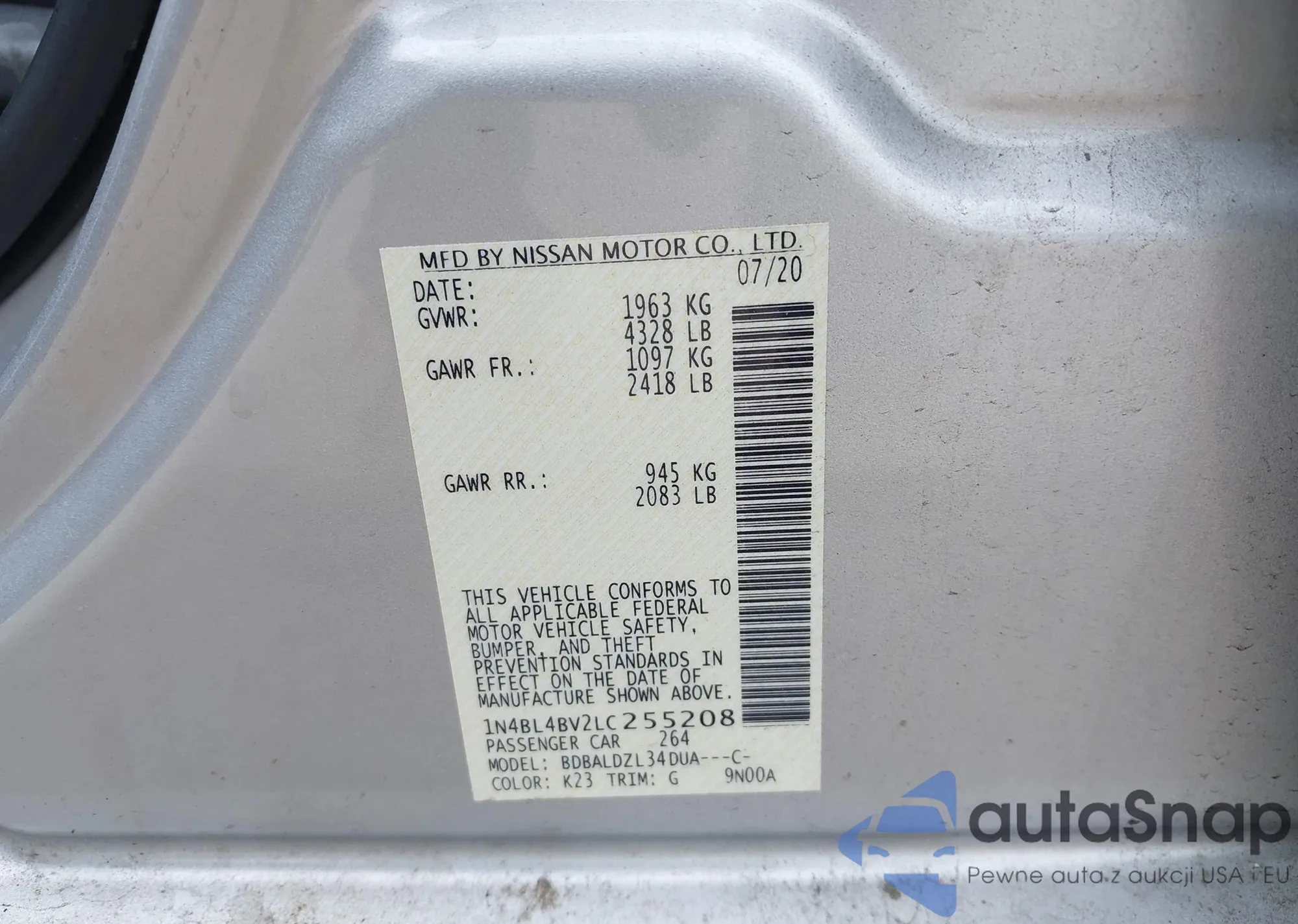 LOT: 43285738 VIN: 1N4BL4BV2LC255208
