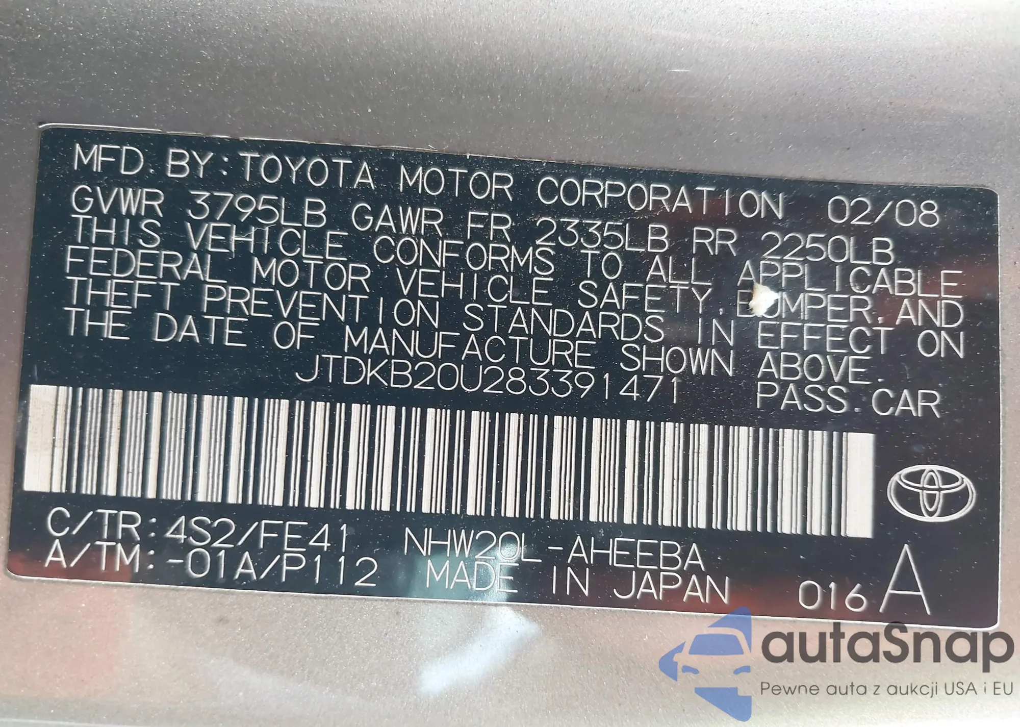 LOT: 43418972 VIN: JTDKB20U283391471