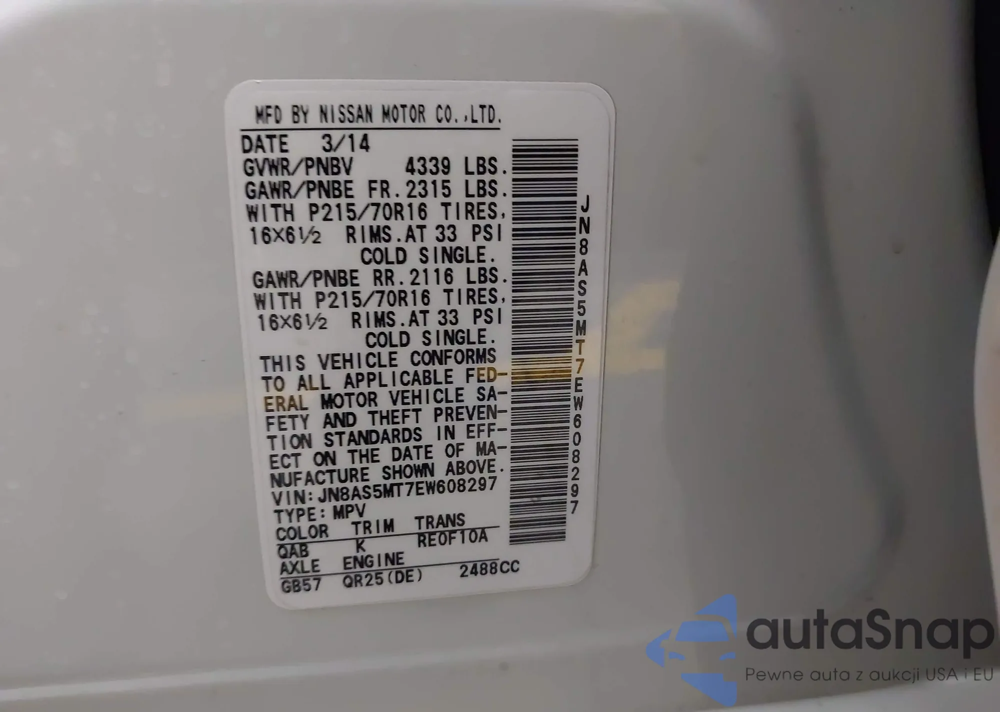 • VIN JN8AS5MT7EW608297