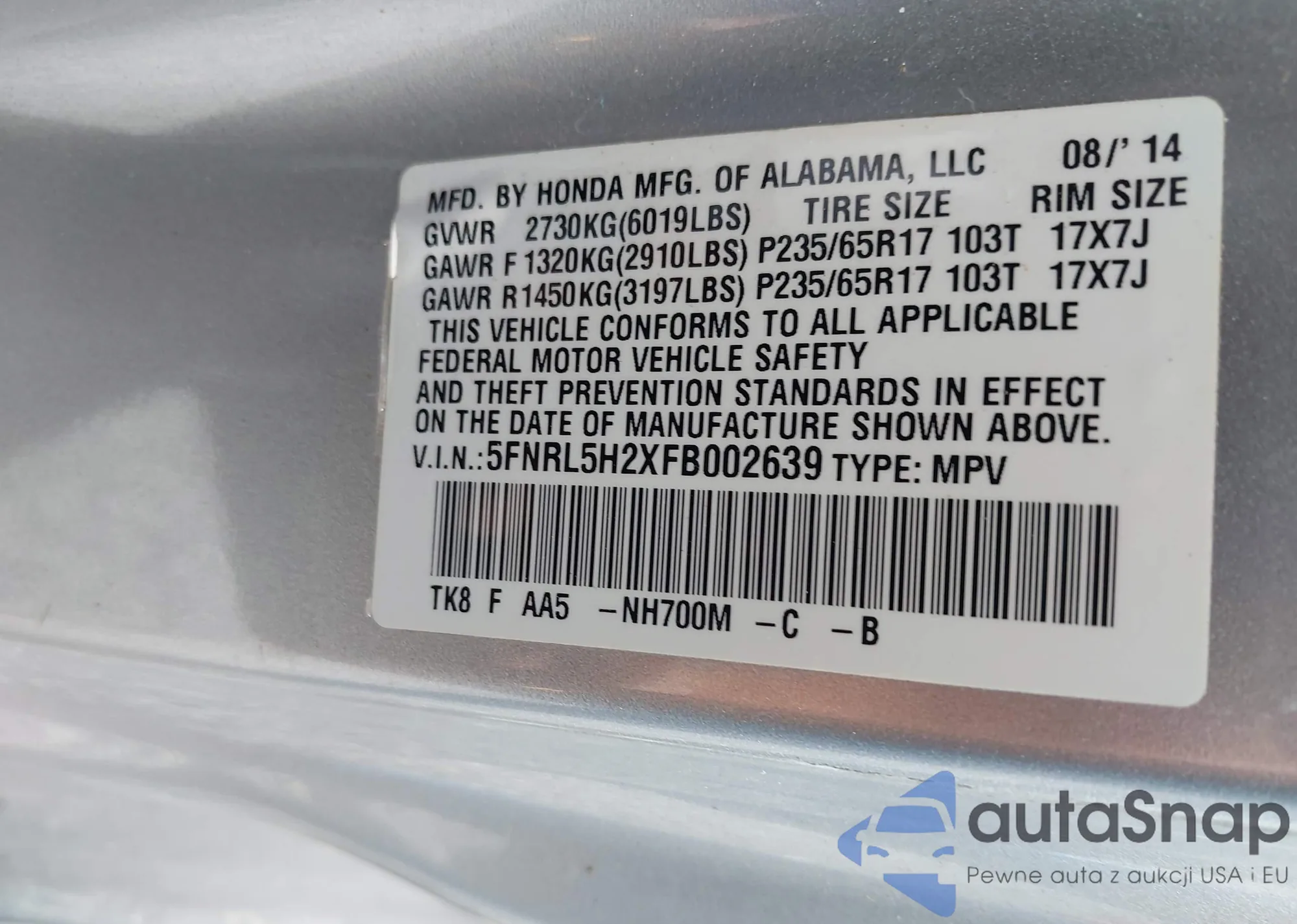 • VIN 5FNRL5H2XFB002639