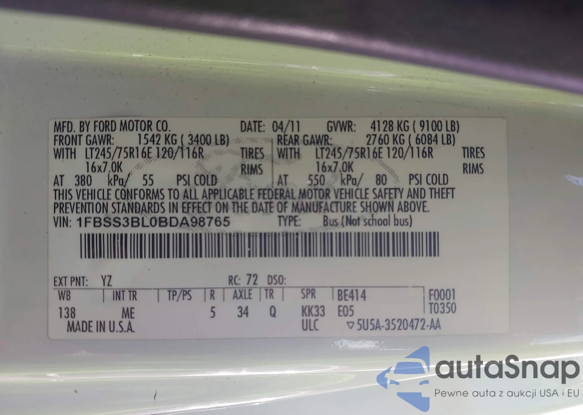 • VIN 1FBSS3BL0BDA98765
