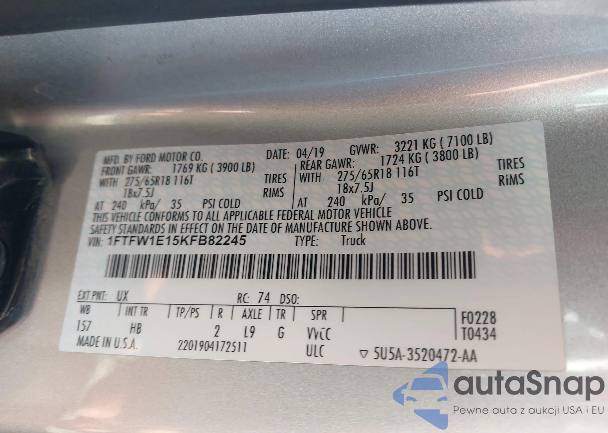 LOT: 43448841 VIN: 1FTFW1E15KFB82245