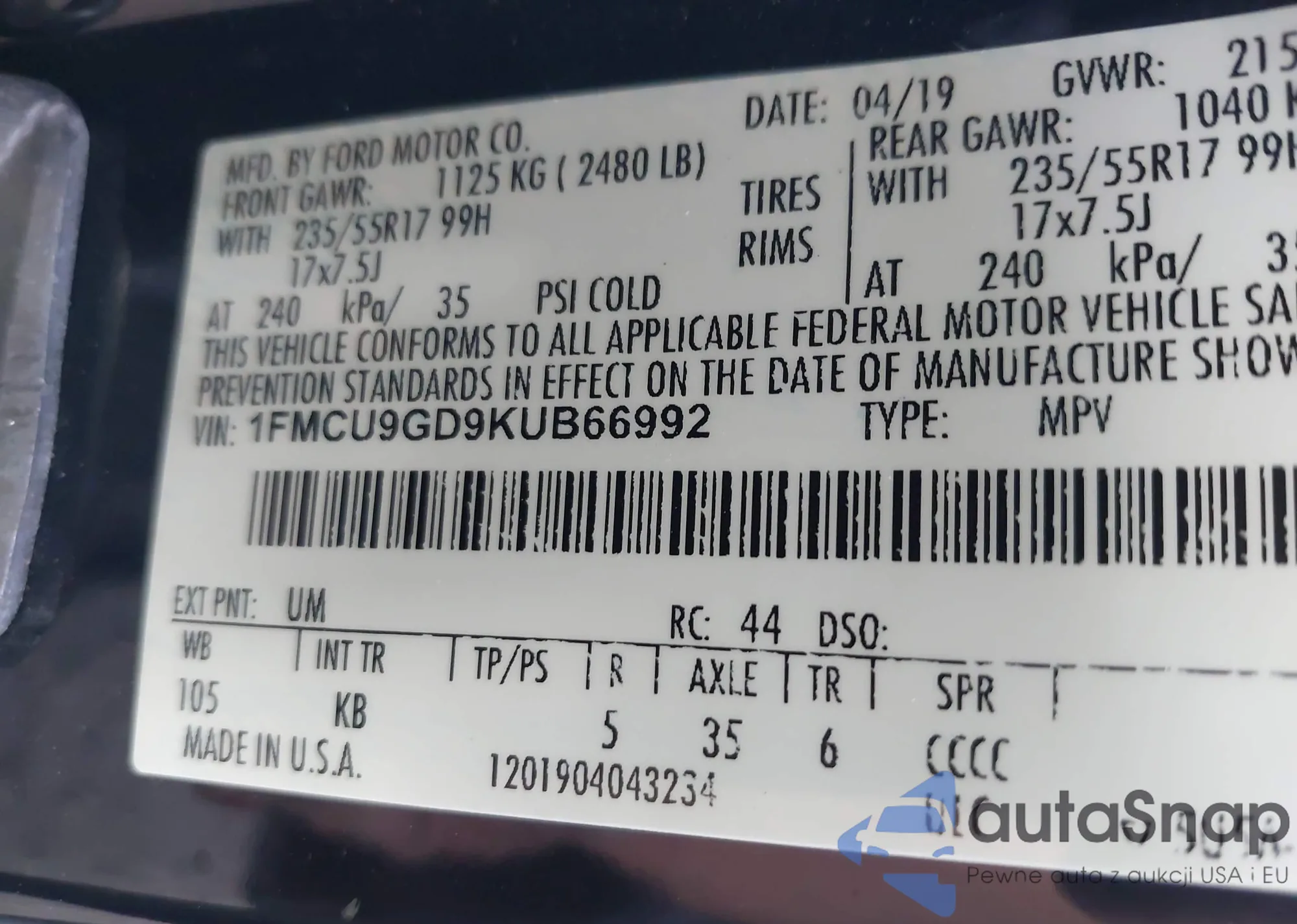 LOT: 43146374 VIN: 1FMCU0J95JUA71473